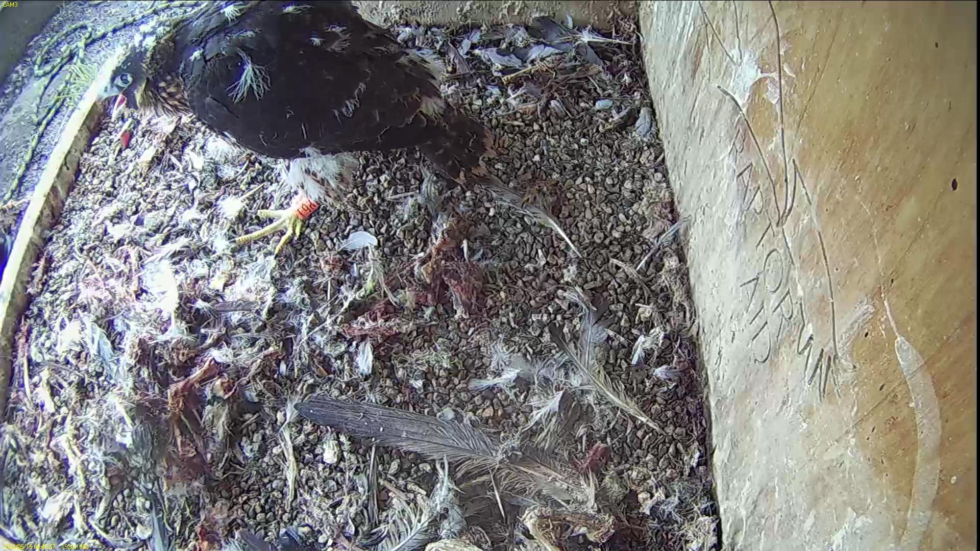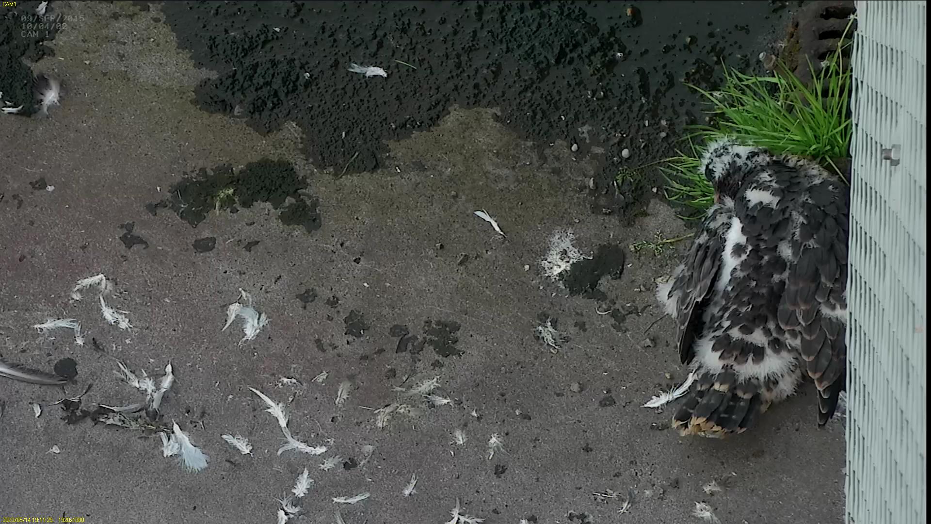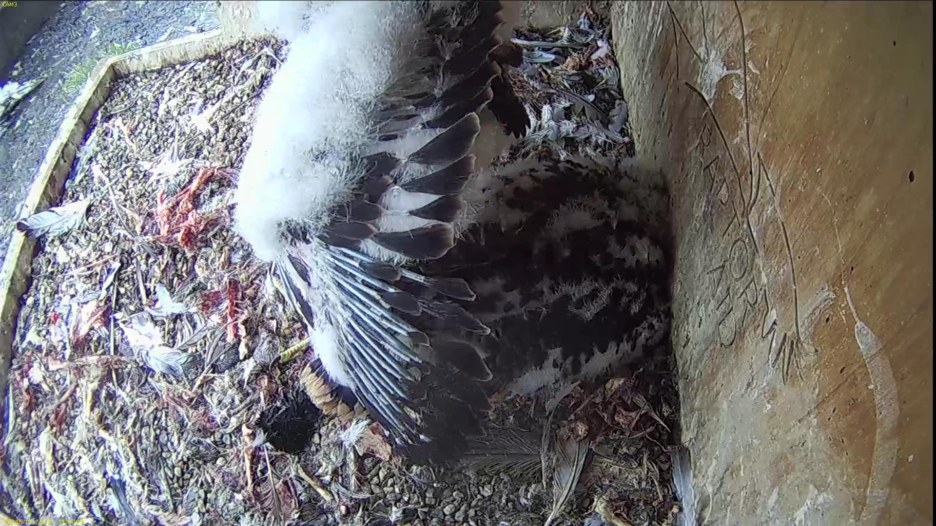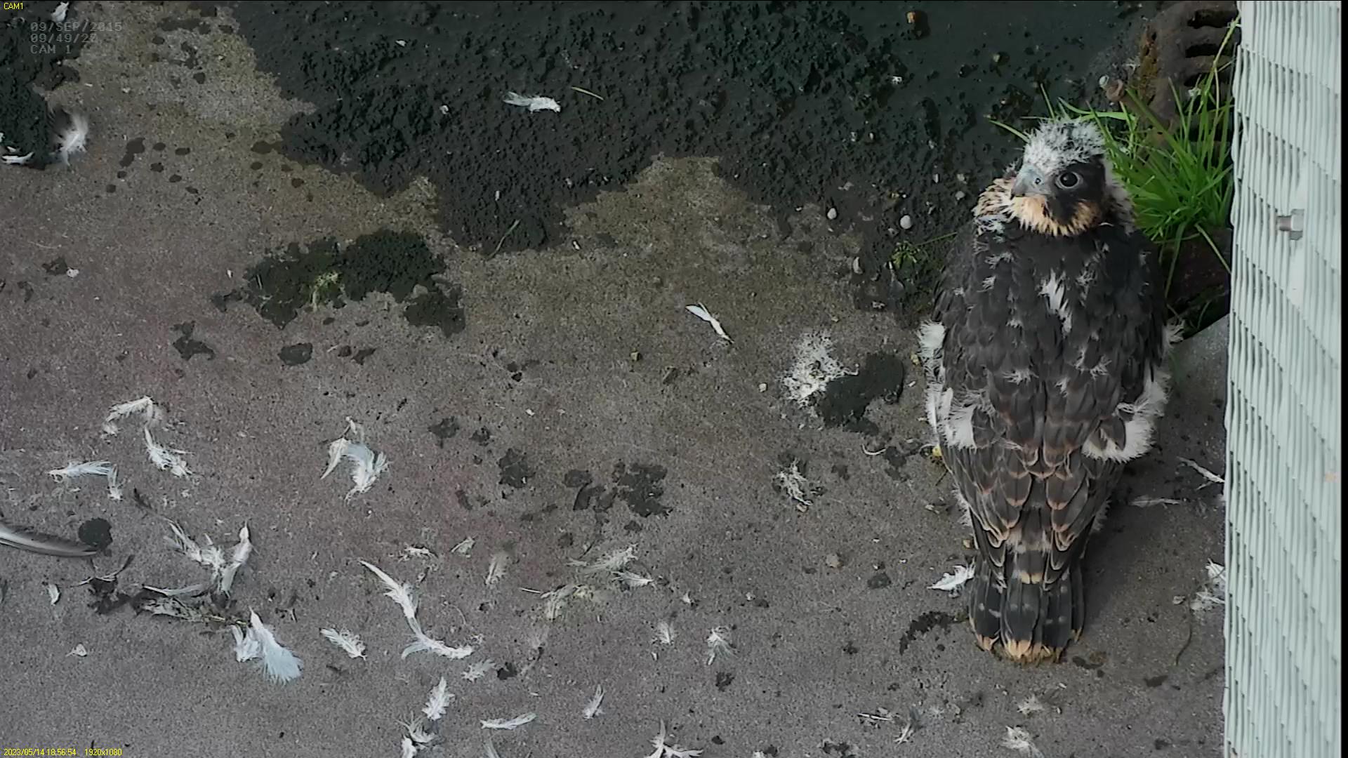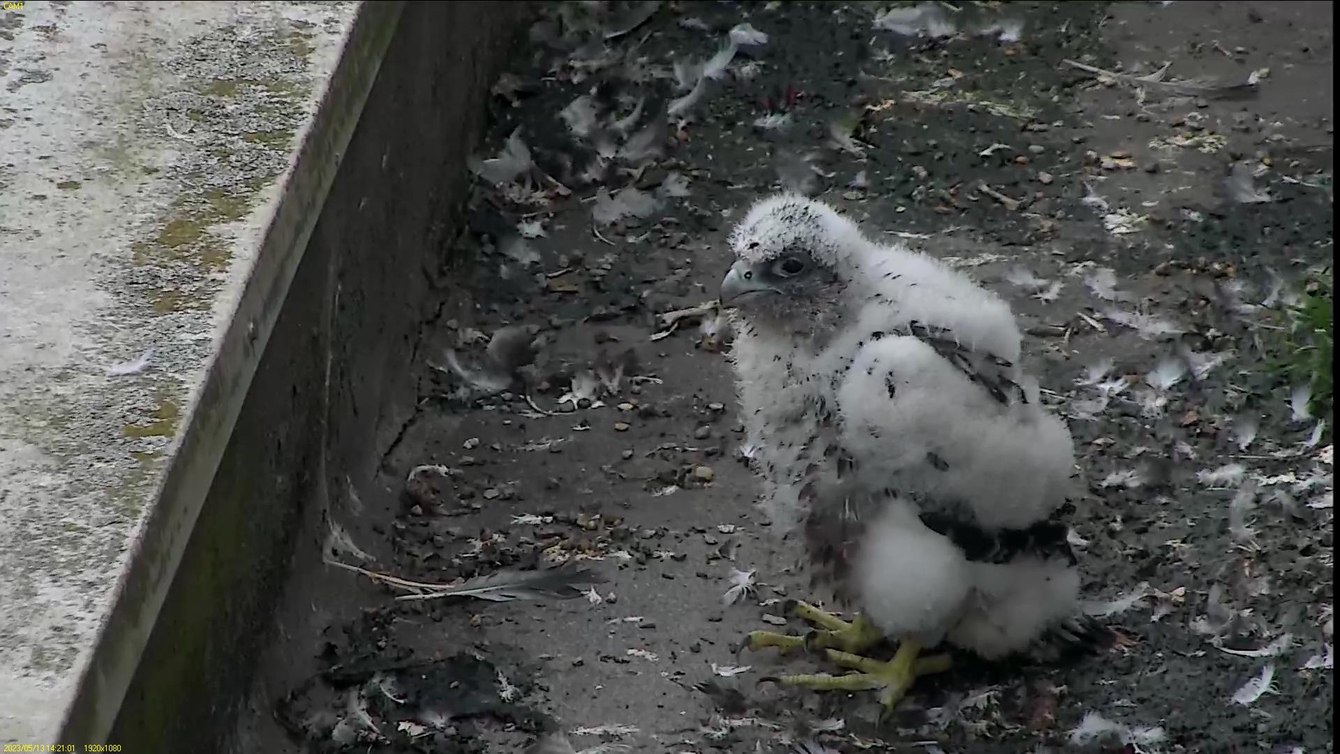 Chick #2 is still full of energy and has been exploring the ledge multiple times today. It is turning into a beautiful dark Peregrine as revealed in the last couple of days with a lot of down falling off. Soon it’ll be just those fluffy pantaloons left!