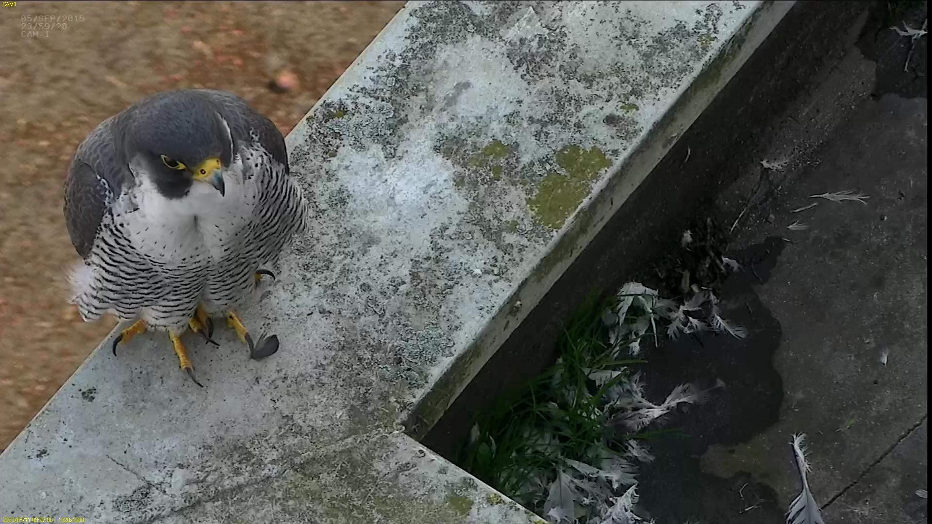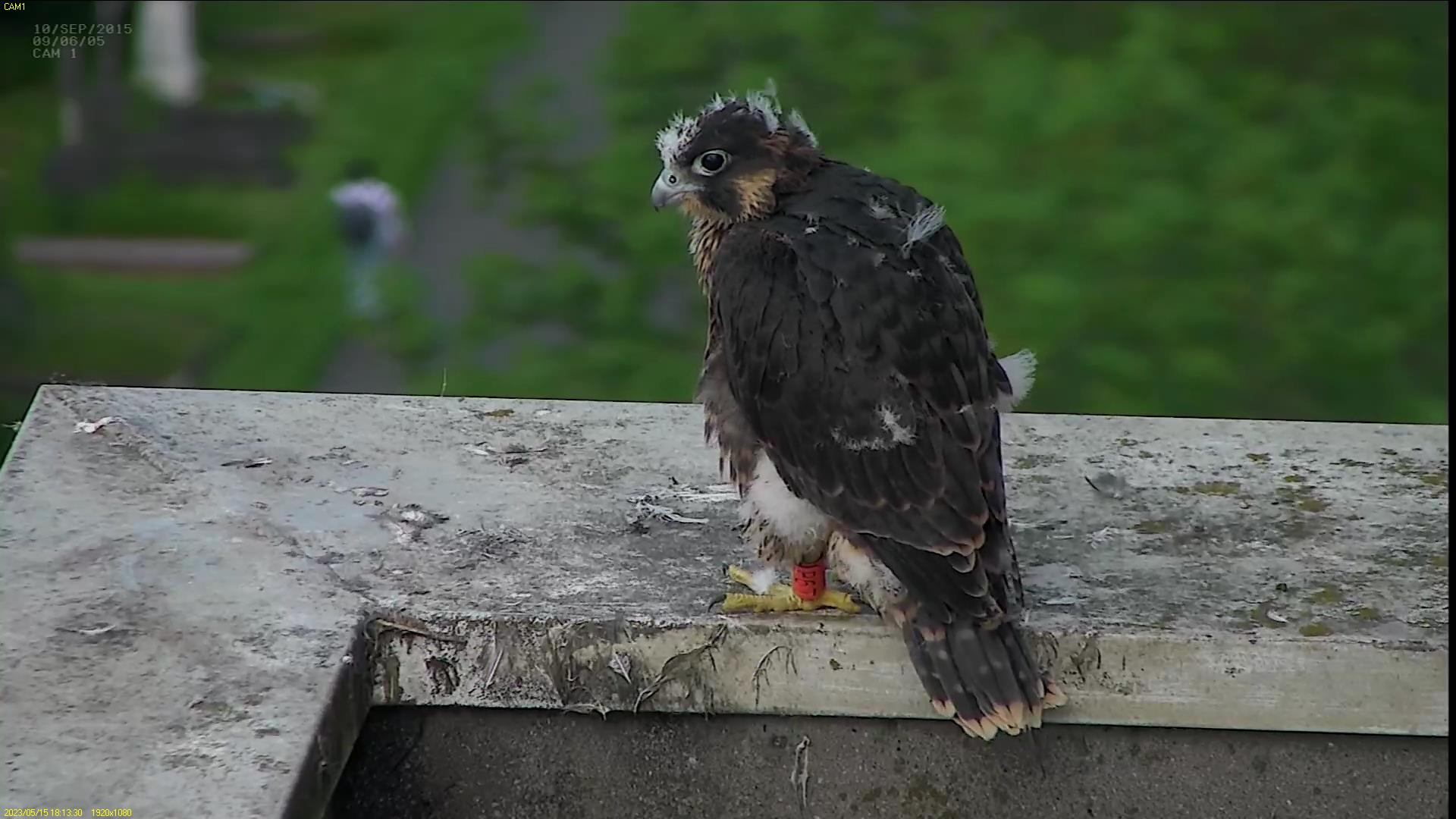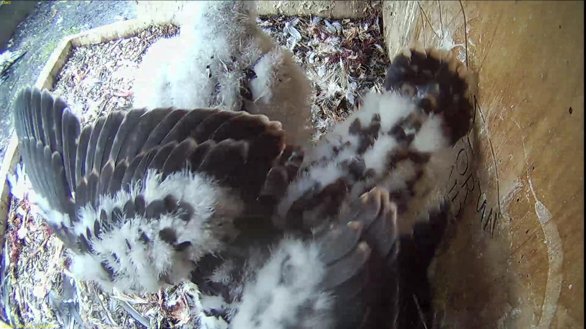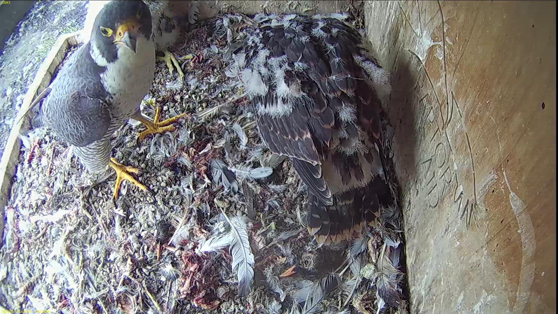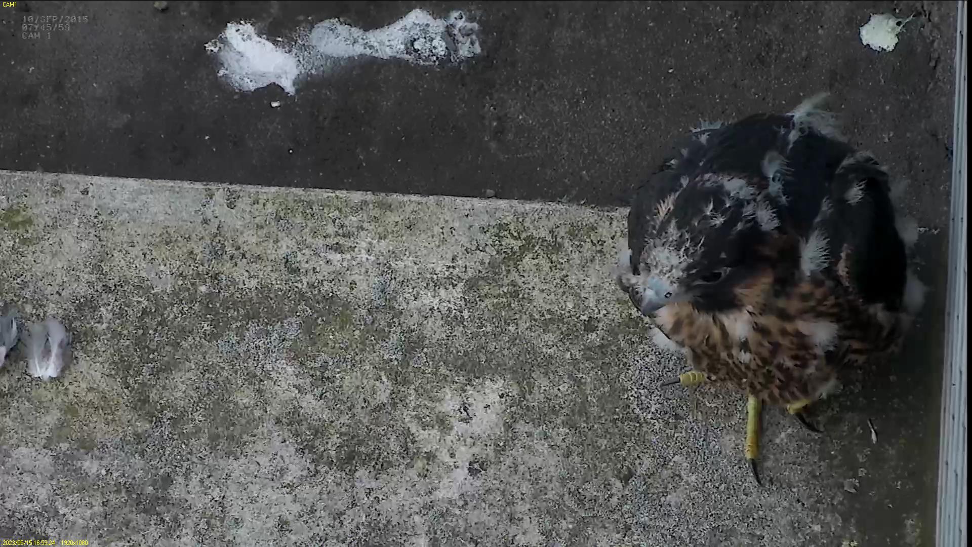 Chick #2 is still full of energy and has been exploring the ledge multiple times today. It is turning into a beautiful dark Peregrine as revealed in the last couple of days with a lot of down falling off. Soon it’ll be just those fluffy pantaloons left!