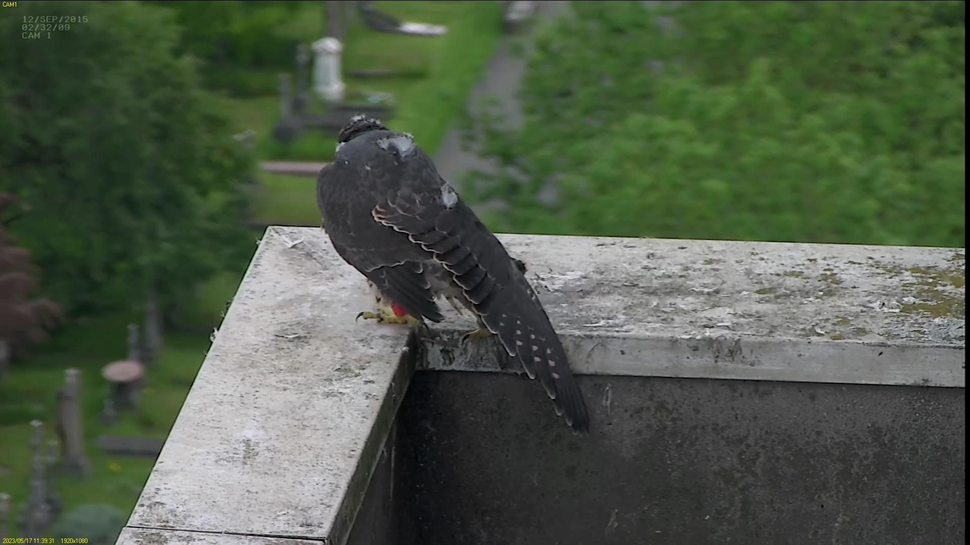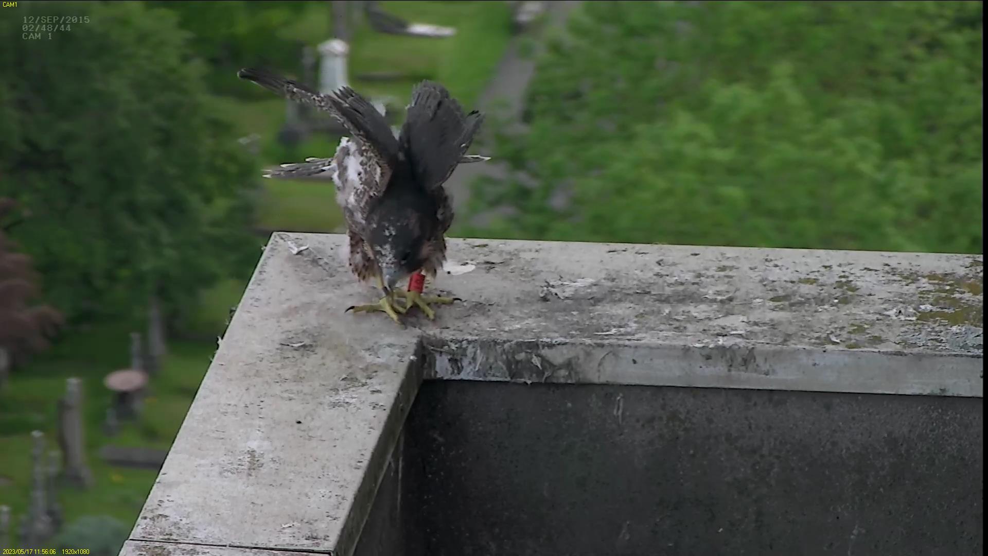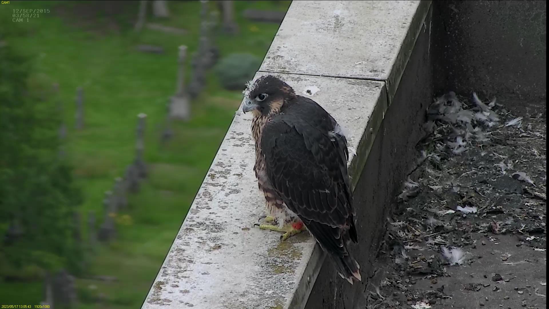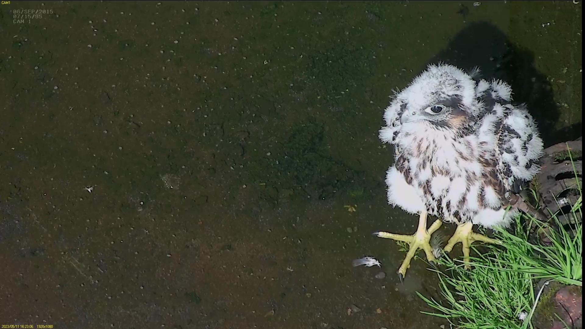 Chick #2 is still full of energy and has been exploring the ledge multiple times today. It is turning into a beautiful dark Peregrine as revealed in the last couple of days with a lot of down falling off. Soon it’ll be just those fluffy pantaloons left!