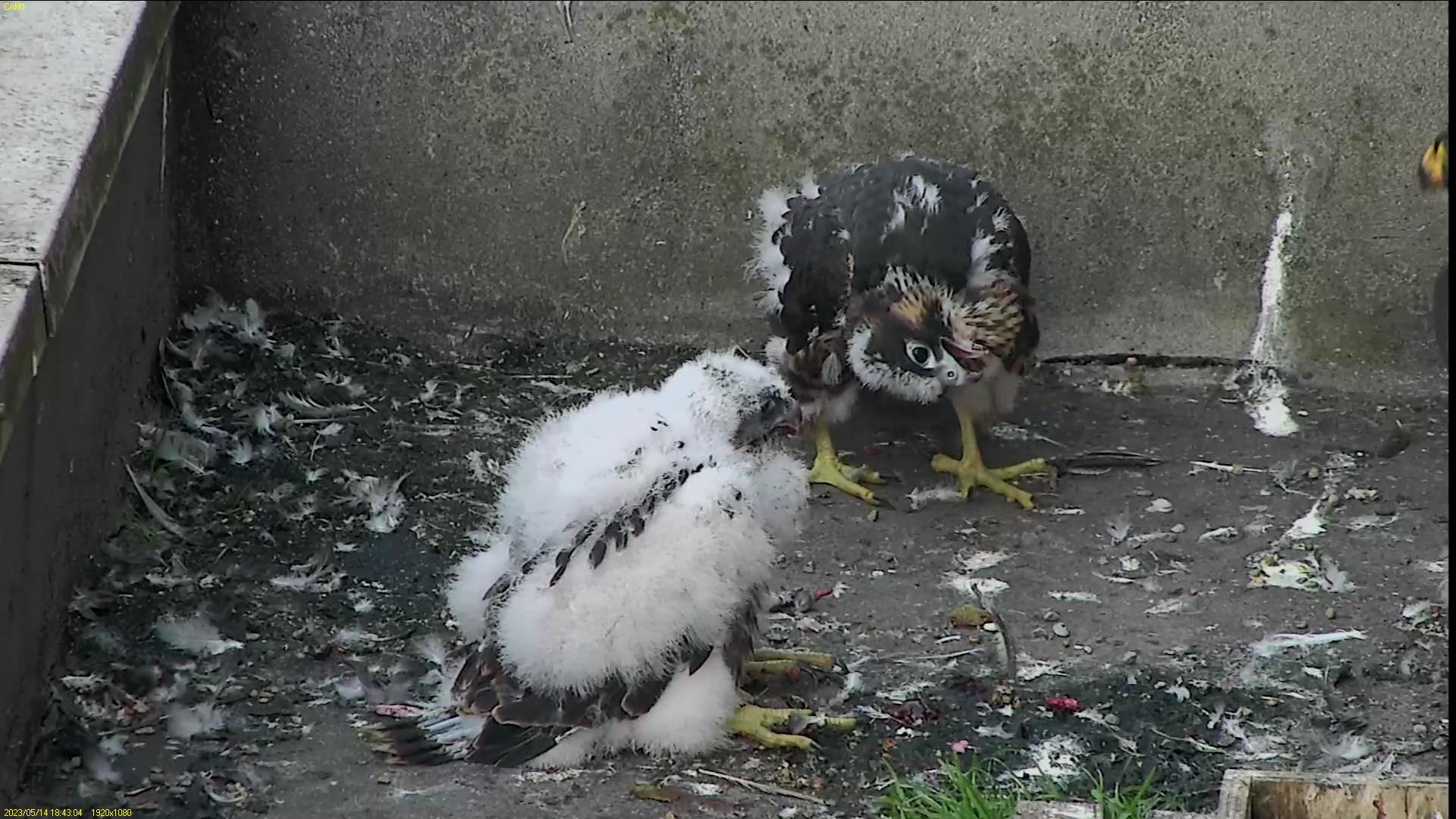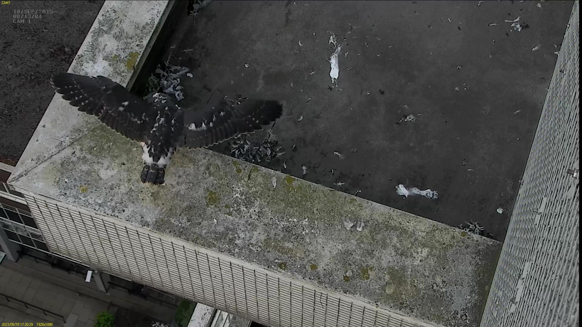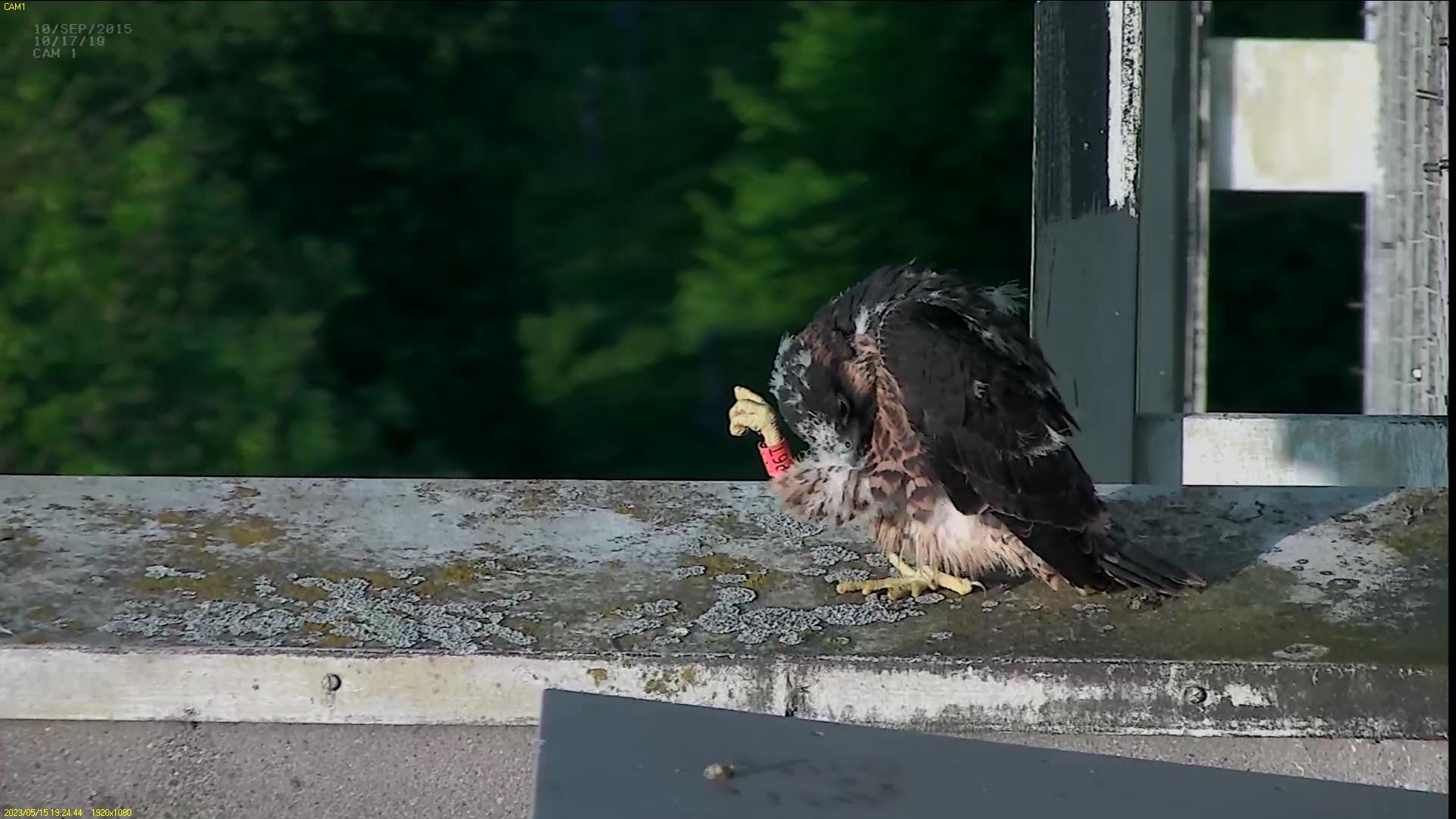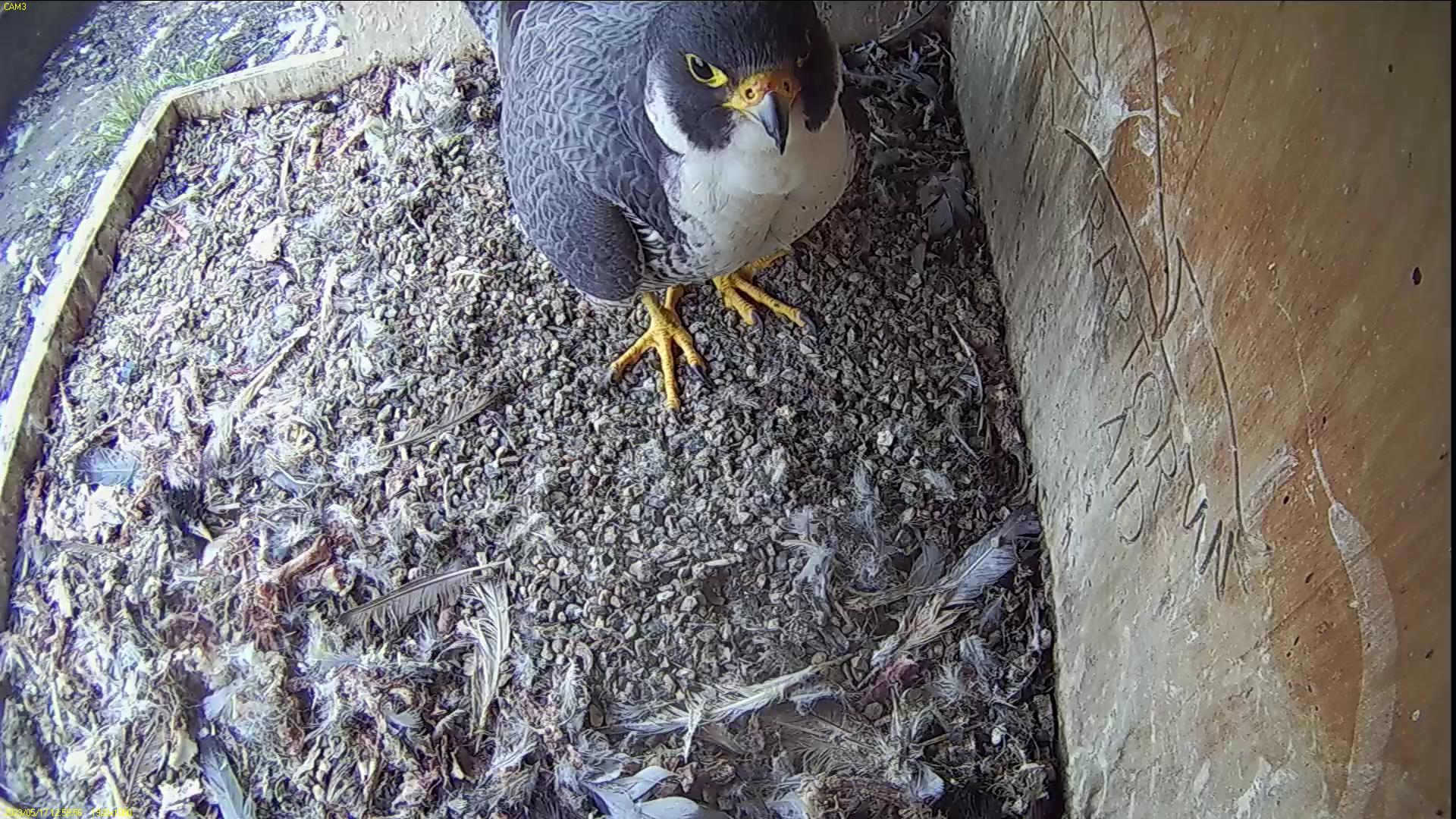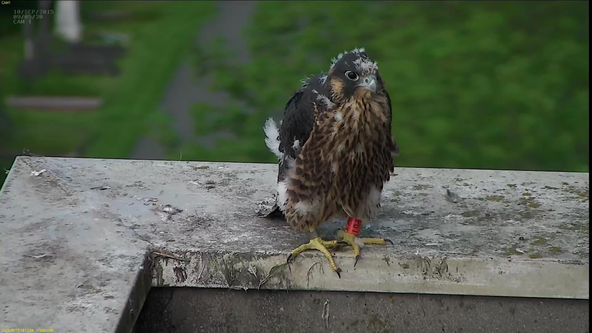 Chick #2 is still full of energy and has been exploring the ledge multiple times today. It is turning into a beautiful dark Peregrine as revealed in the last couple of days with a lot of down falling off. Soon it’ll be just those fluffy pantaloons left!