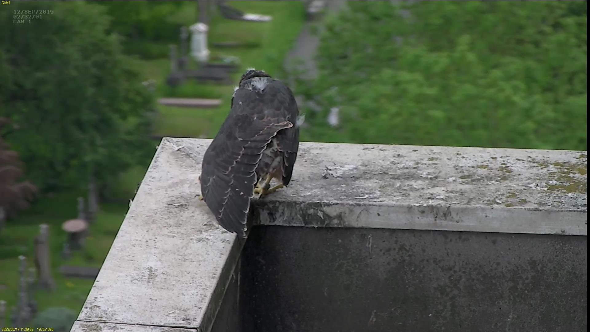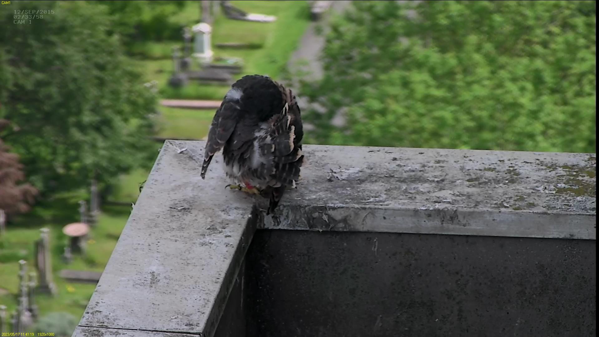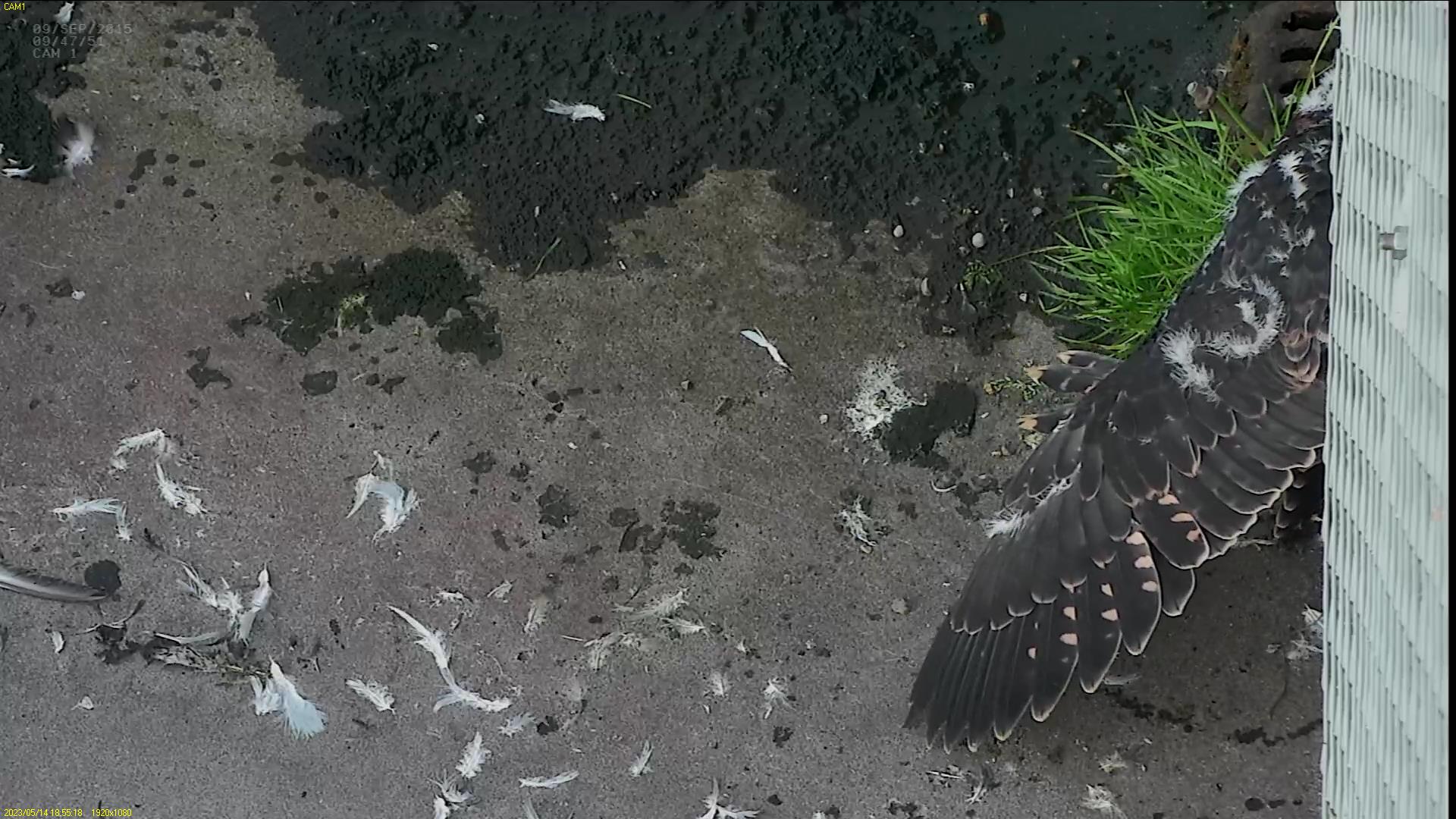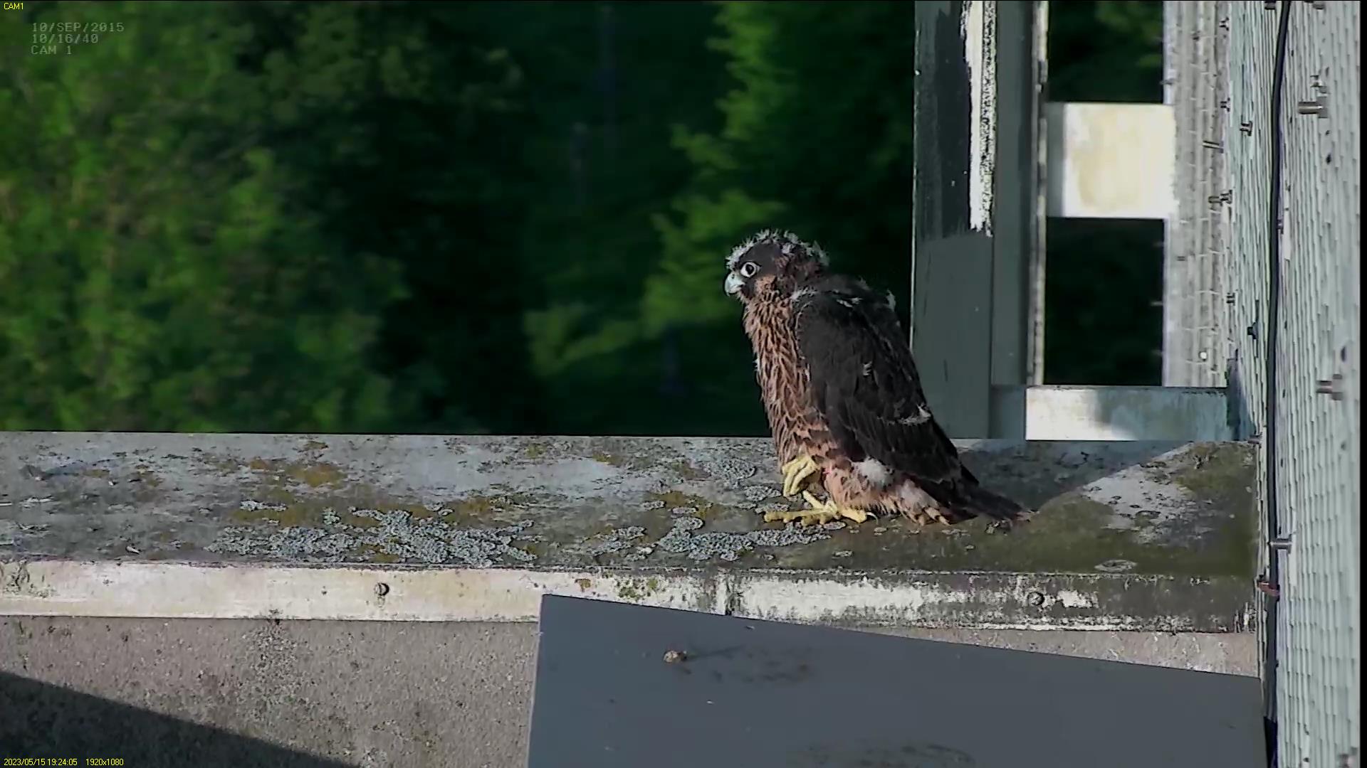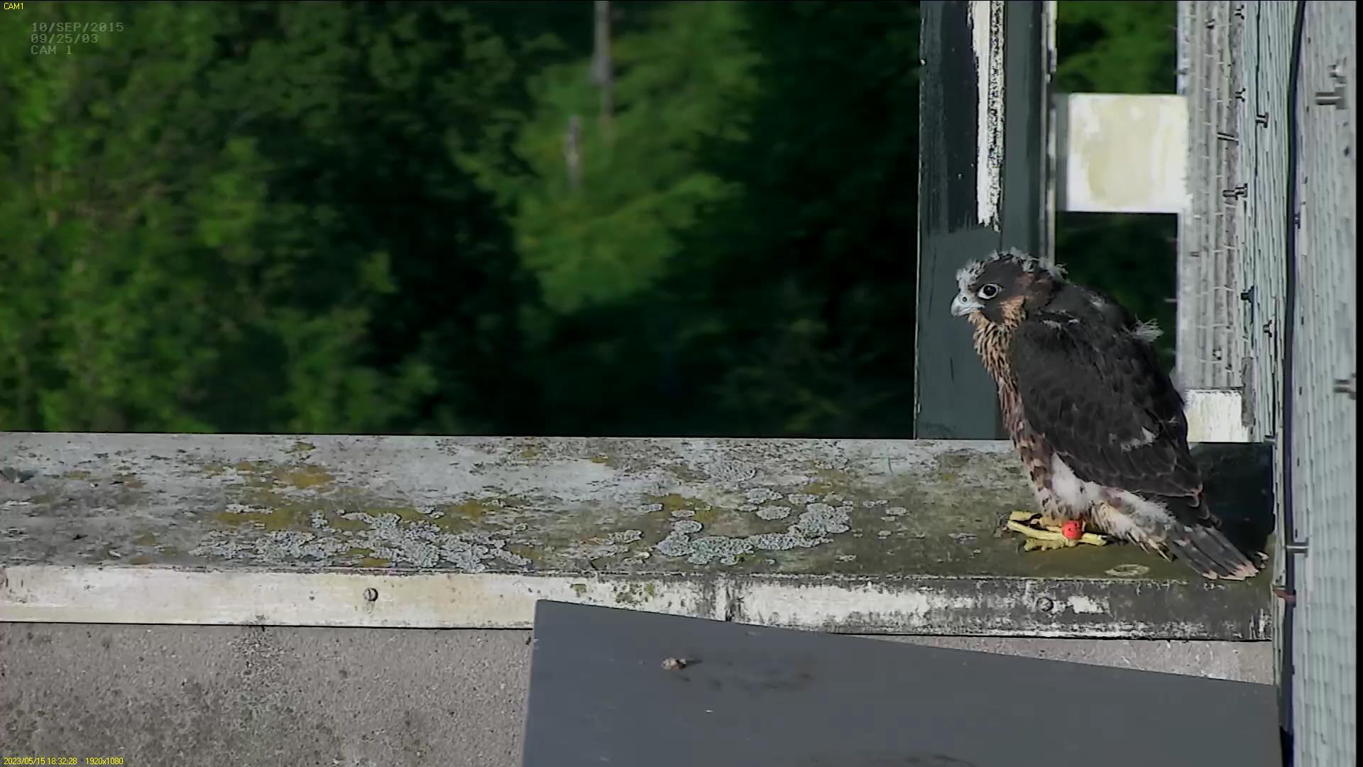Chick #2 is still full of energy and has been exploring the ledge multiple times today. It is turning into a beautiful dark Peregrine as revealed in the last couple of days with a lot of down falling off. Soon it’ll be just those fluffy pantaloons left!