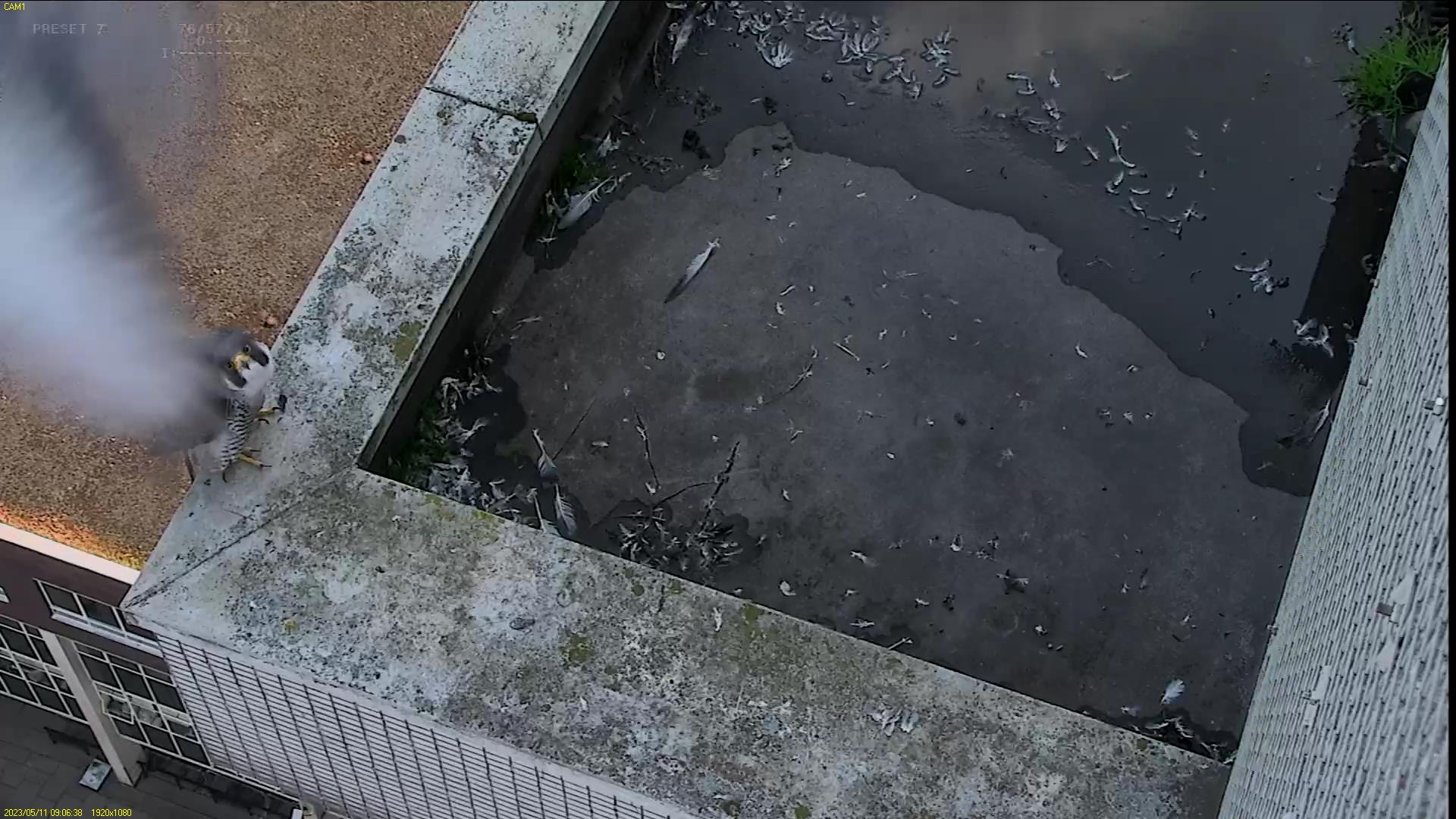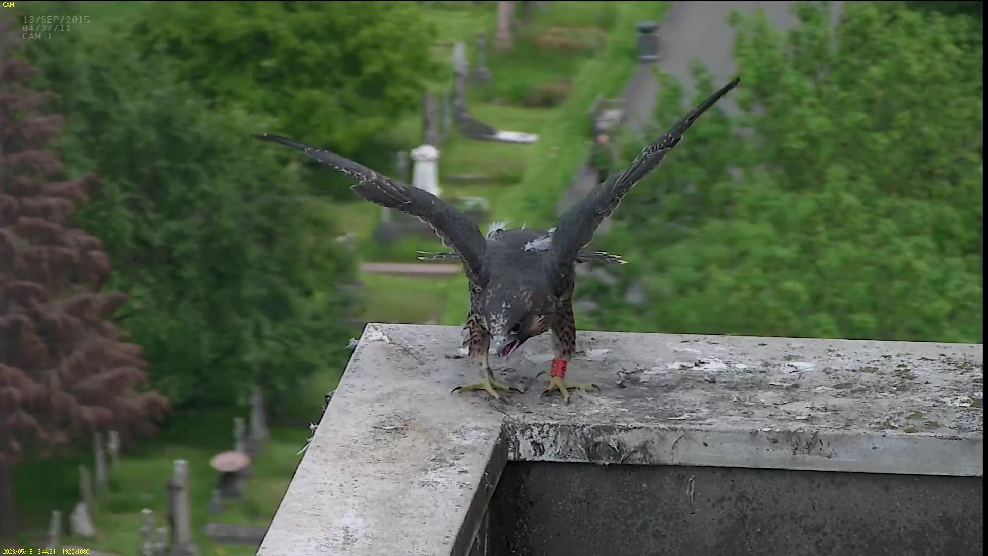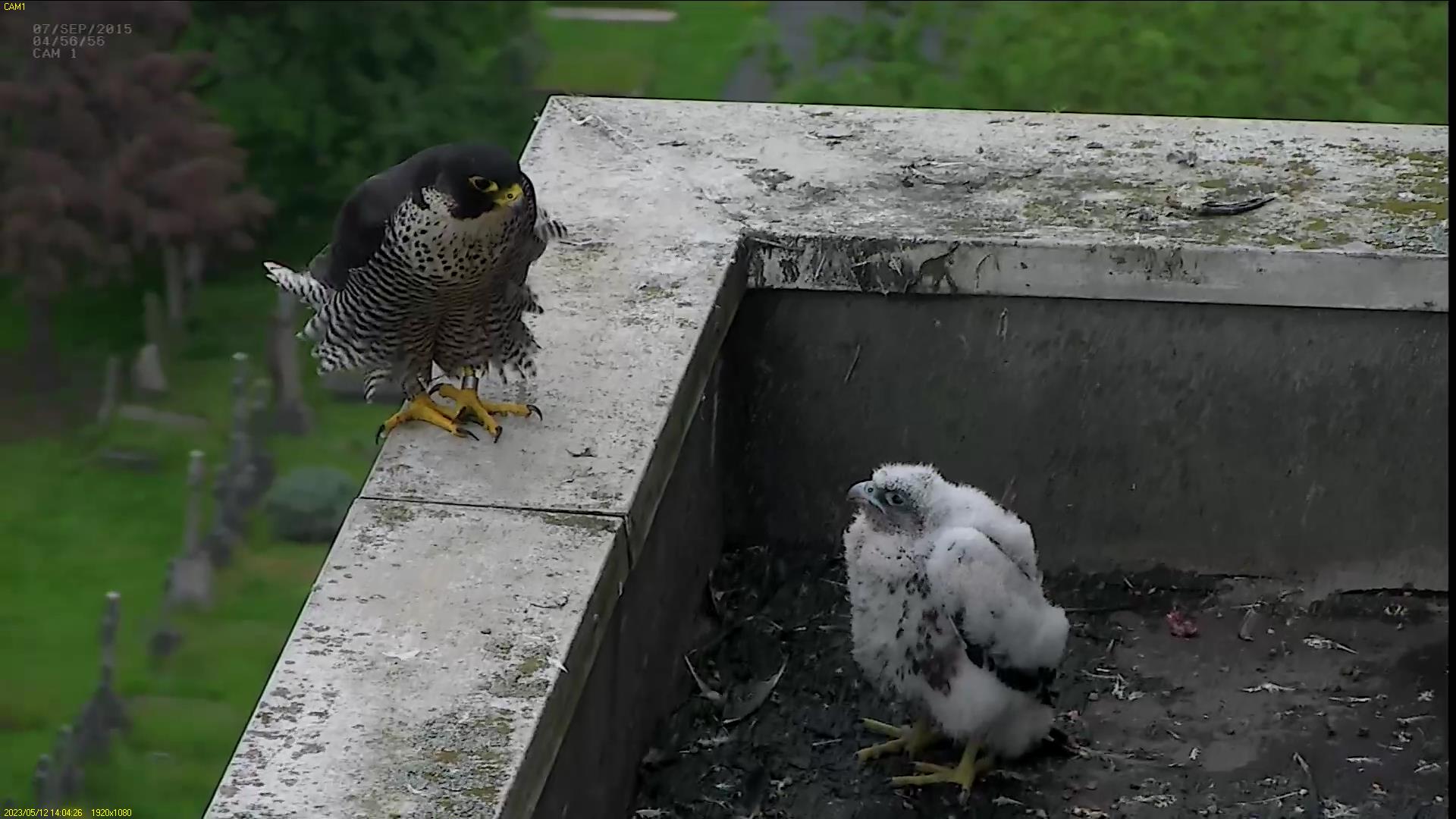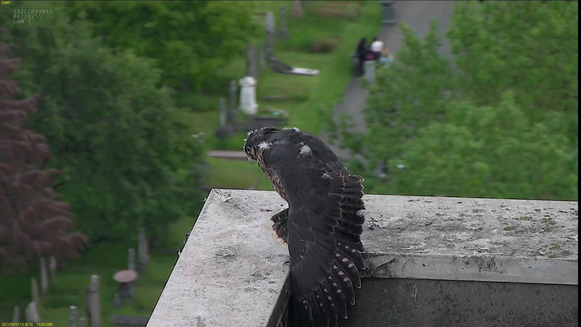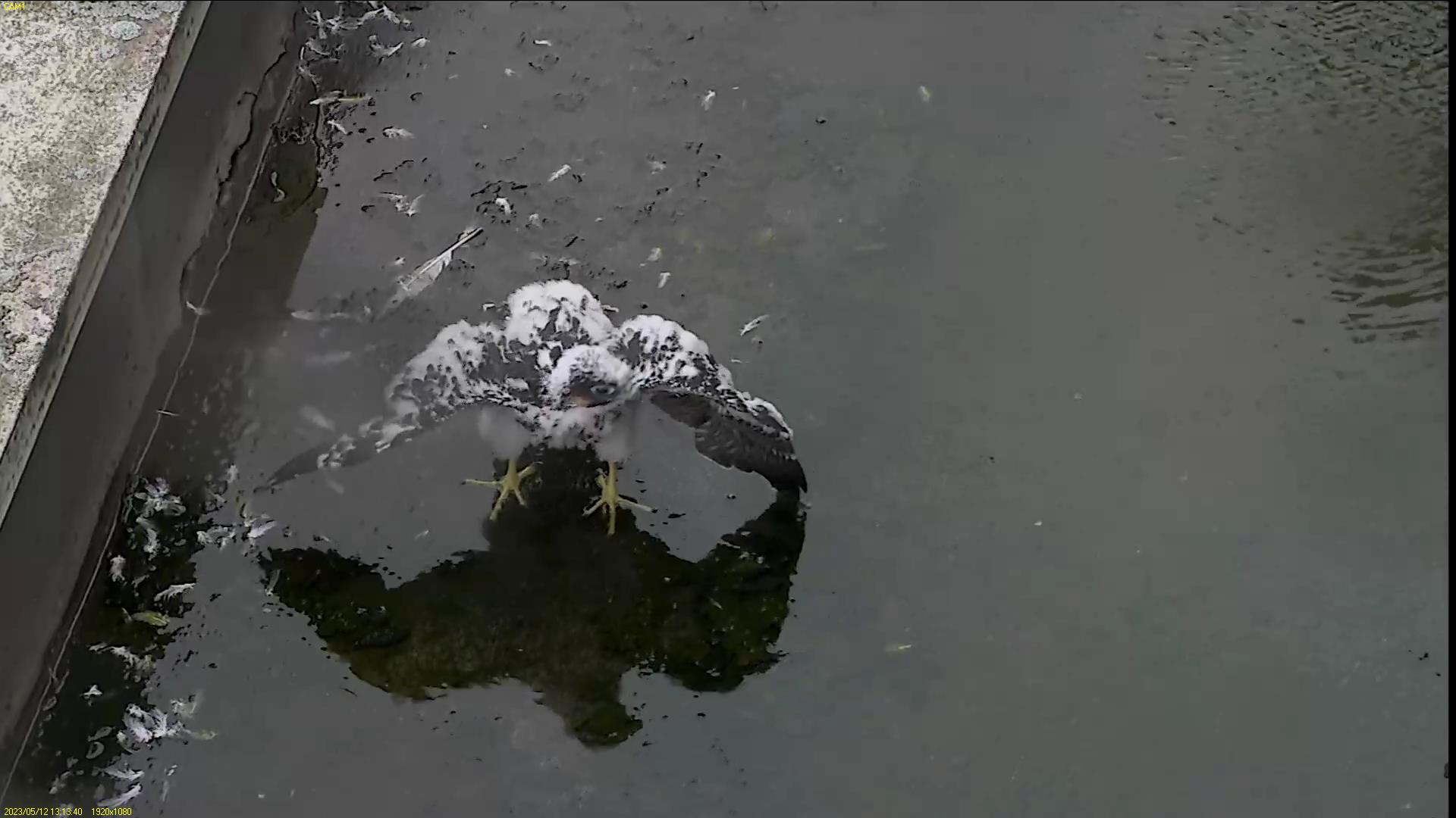 Chick #2 is still full of energy and has been exploring the ledge multiple times today. It is turning into a beautiful dark Peregrine as revealed in the last couple of days with a lot of down falling off. Soon it’ll be just those fluffy pantaloons left!