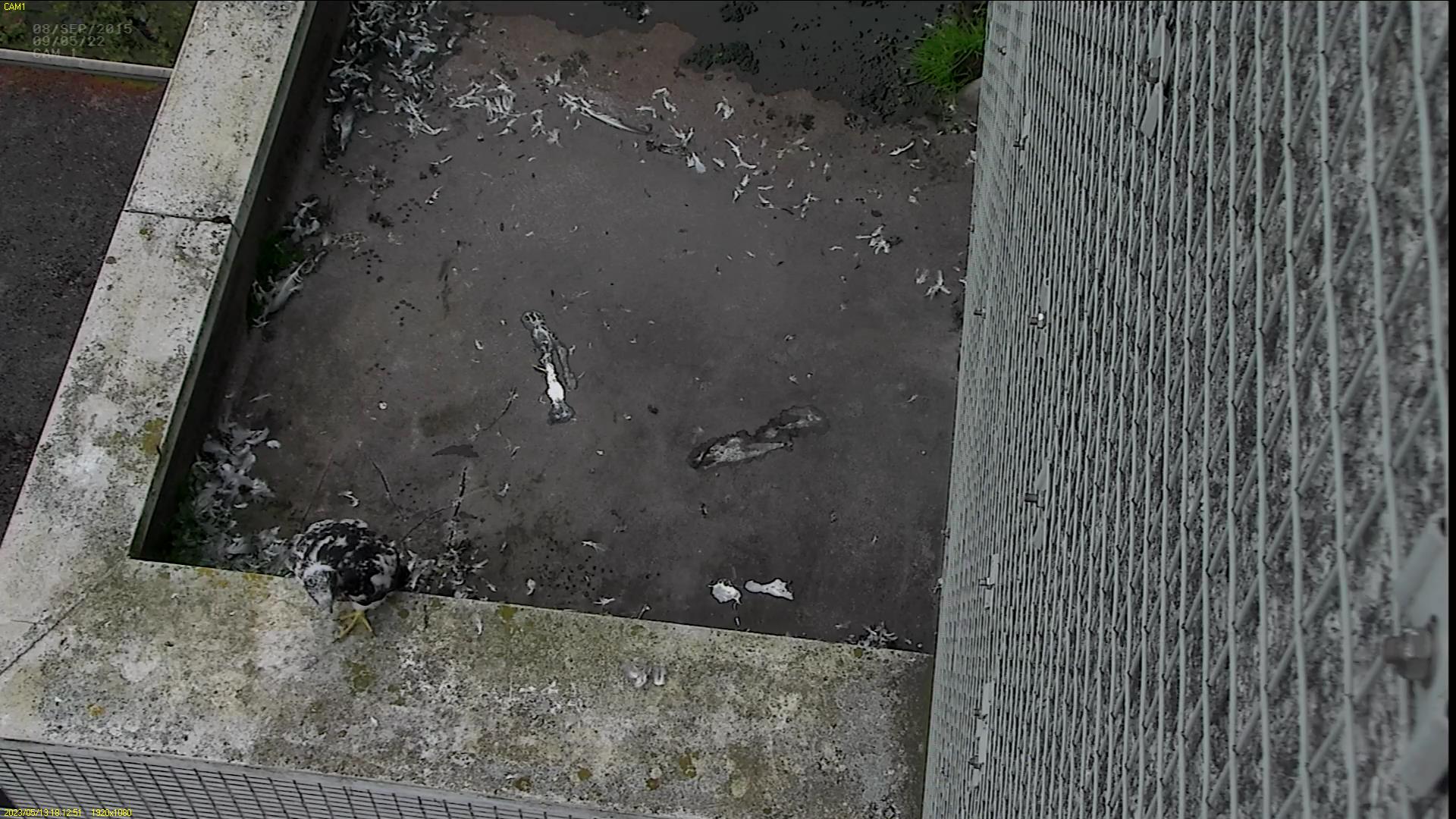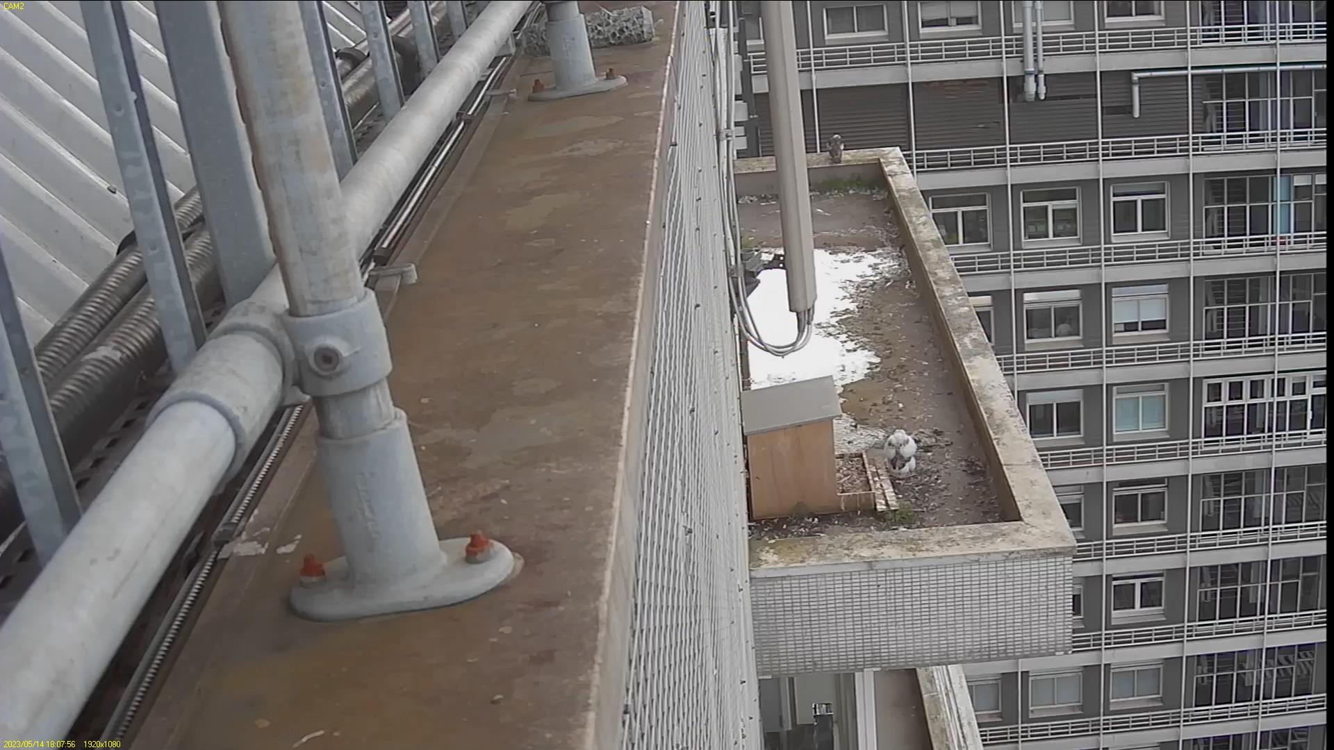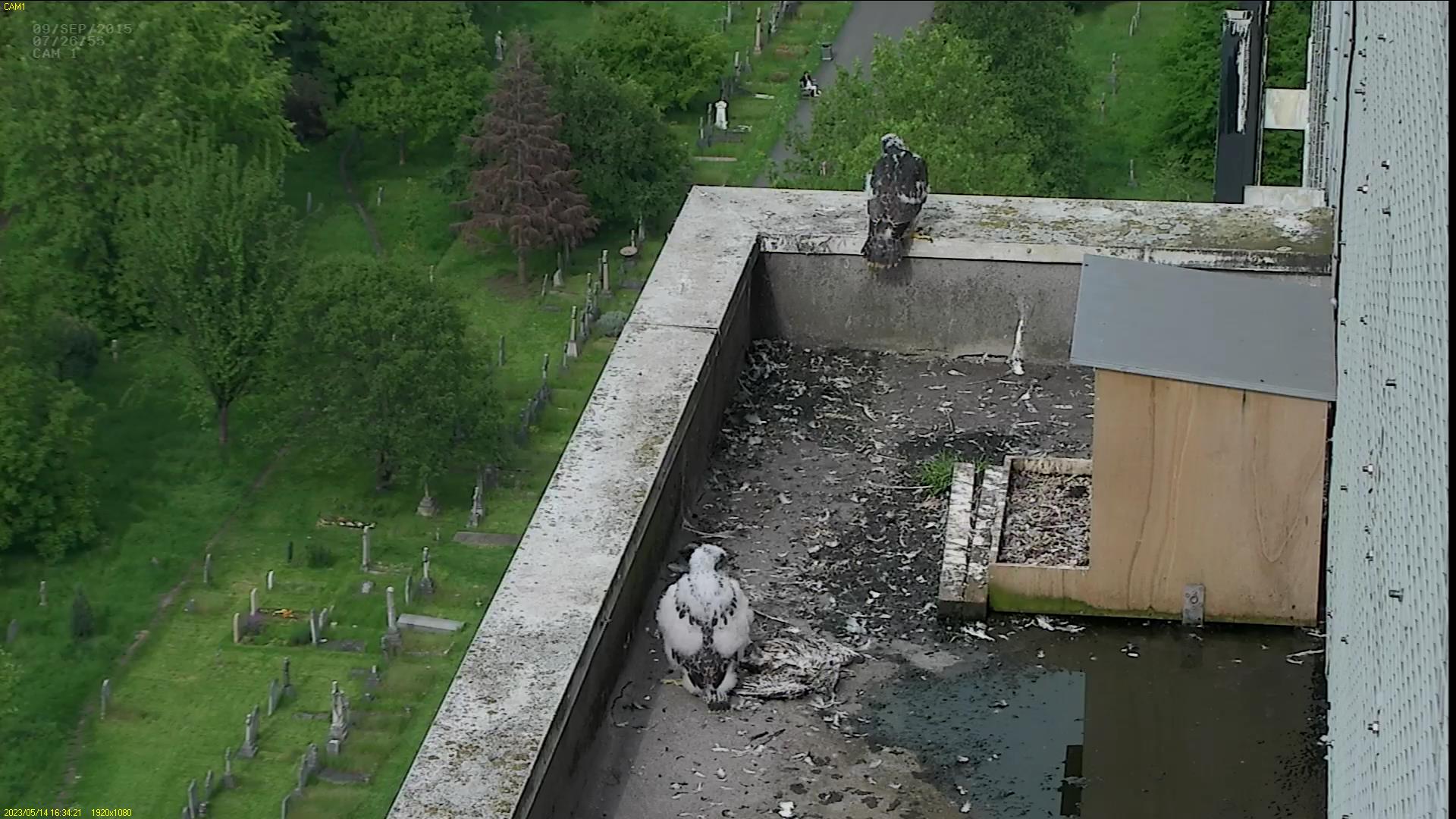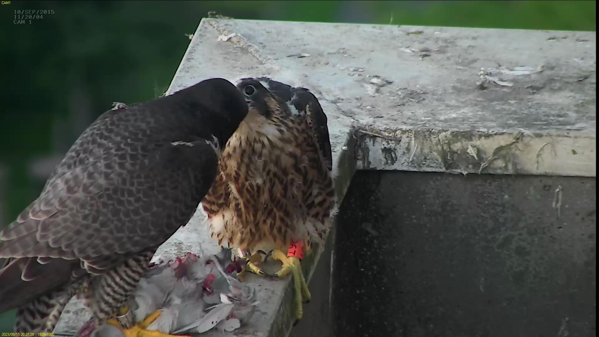Chick #2 is still full of energy and has been exploring the ledge multiple times today. It is turning into a beautiful dark Peregrine as revealed in the last couple of days with a lot of down falling off. Soon it’ll be just those fluffy pantaloons left!