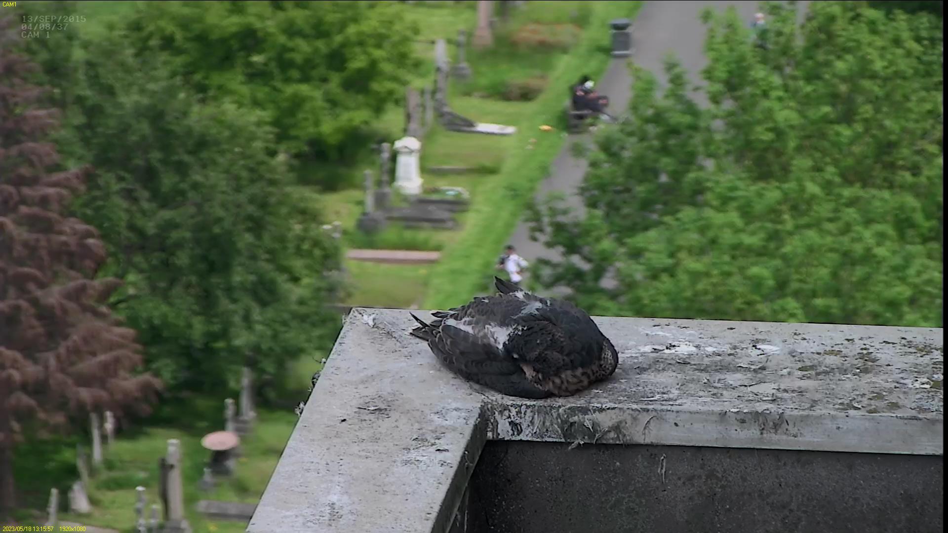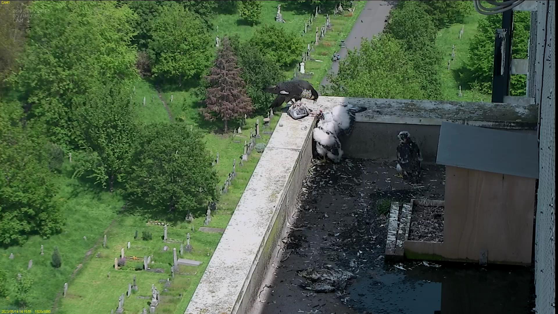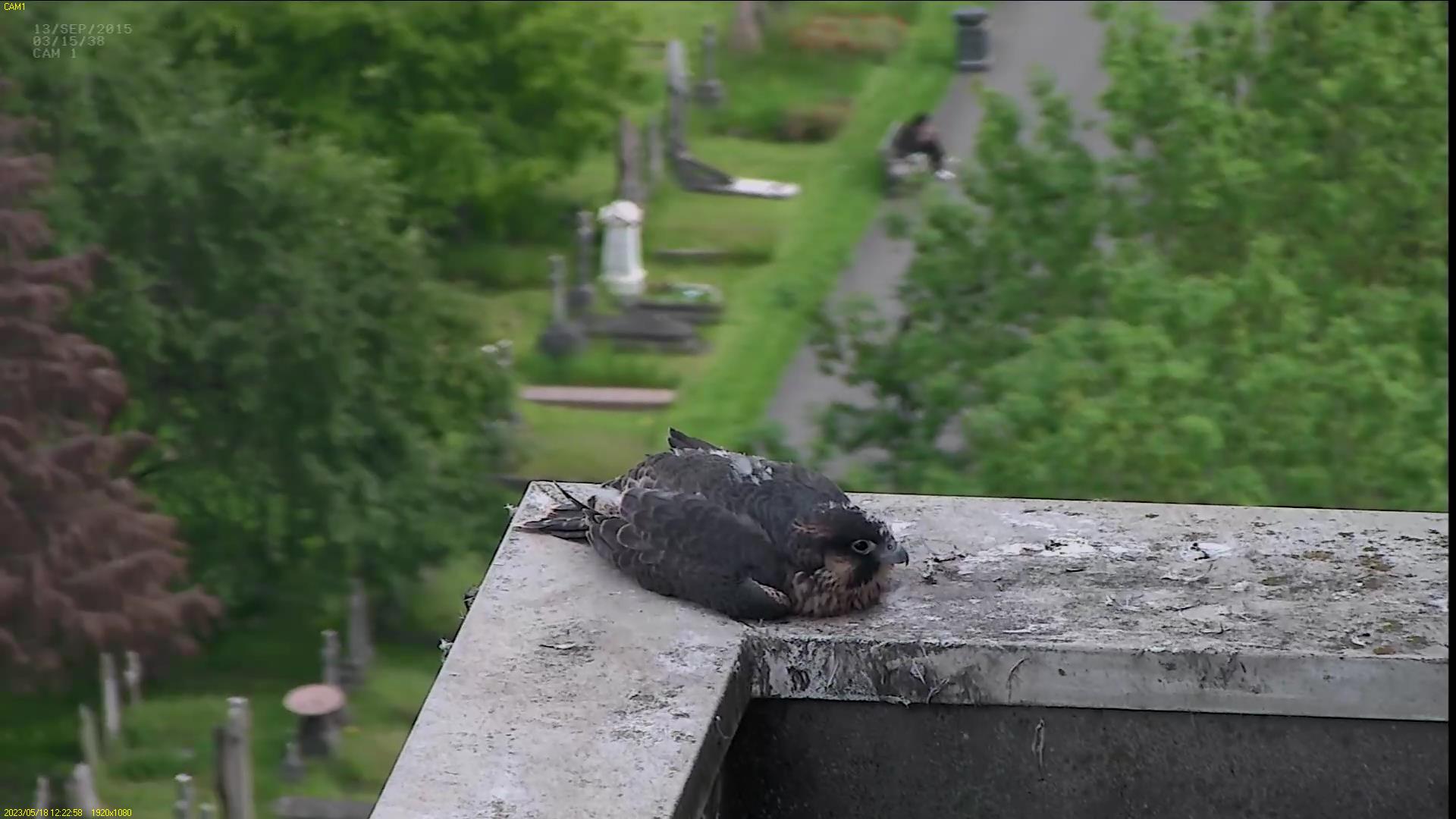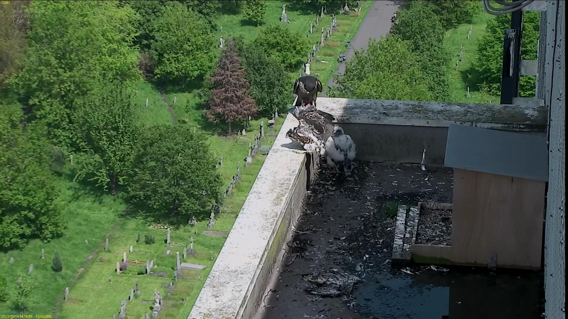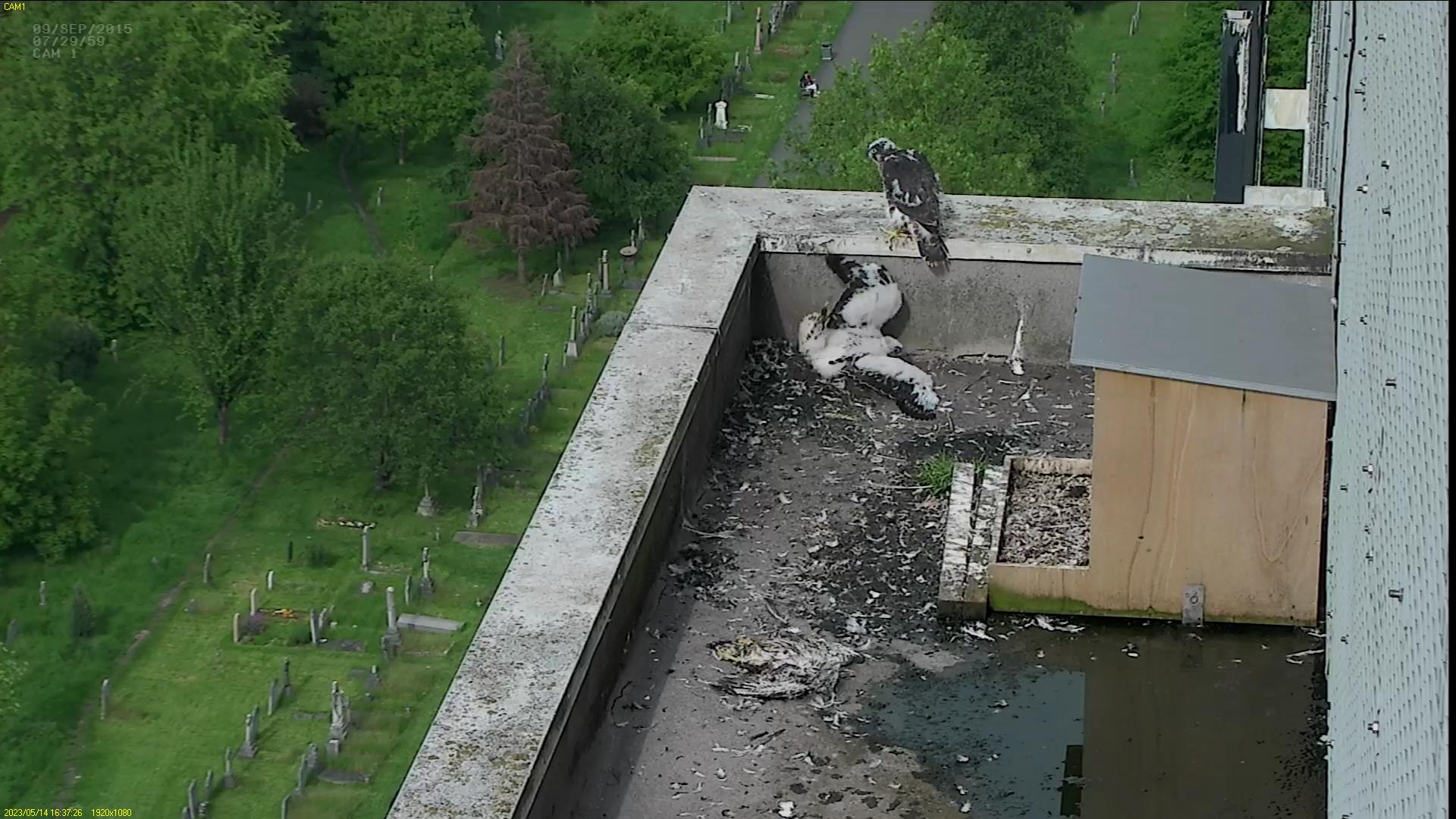 Chick #2 is still full of energy and has been exploring the ledge multiple times today. It is turning into a beautiful dark Peregrine as revealed in the last couple of days with a lot of down falling off. Soon it’ll be just those fluffy pantaloons left!