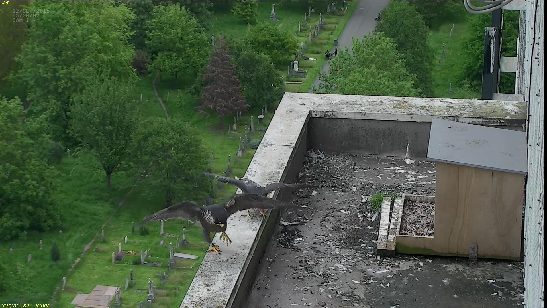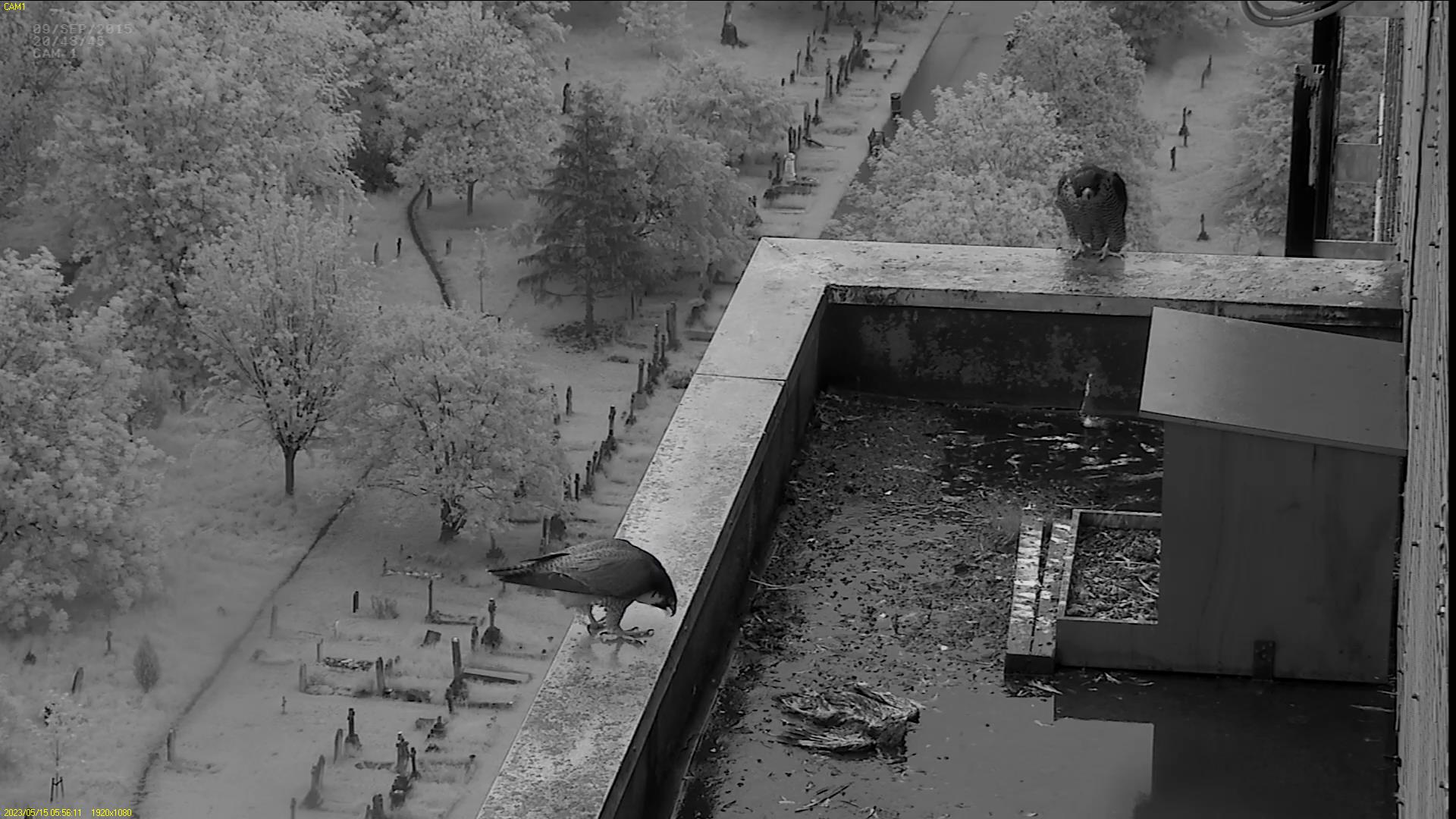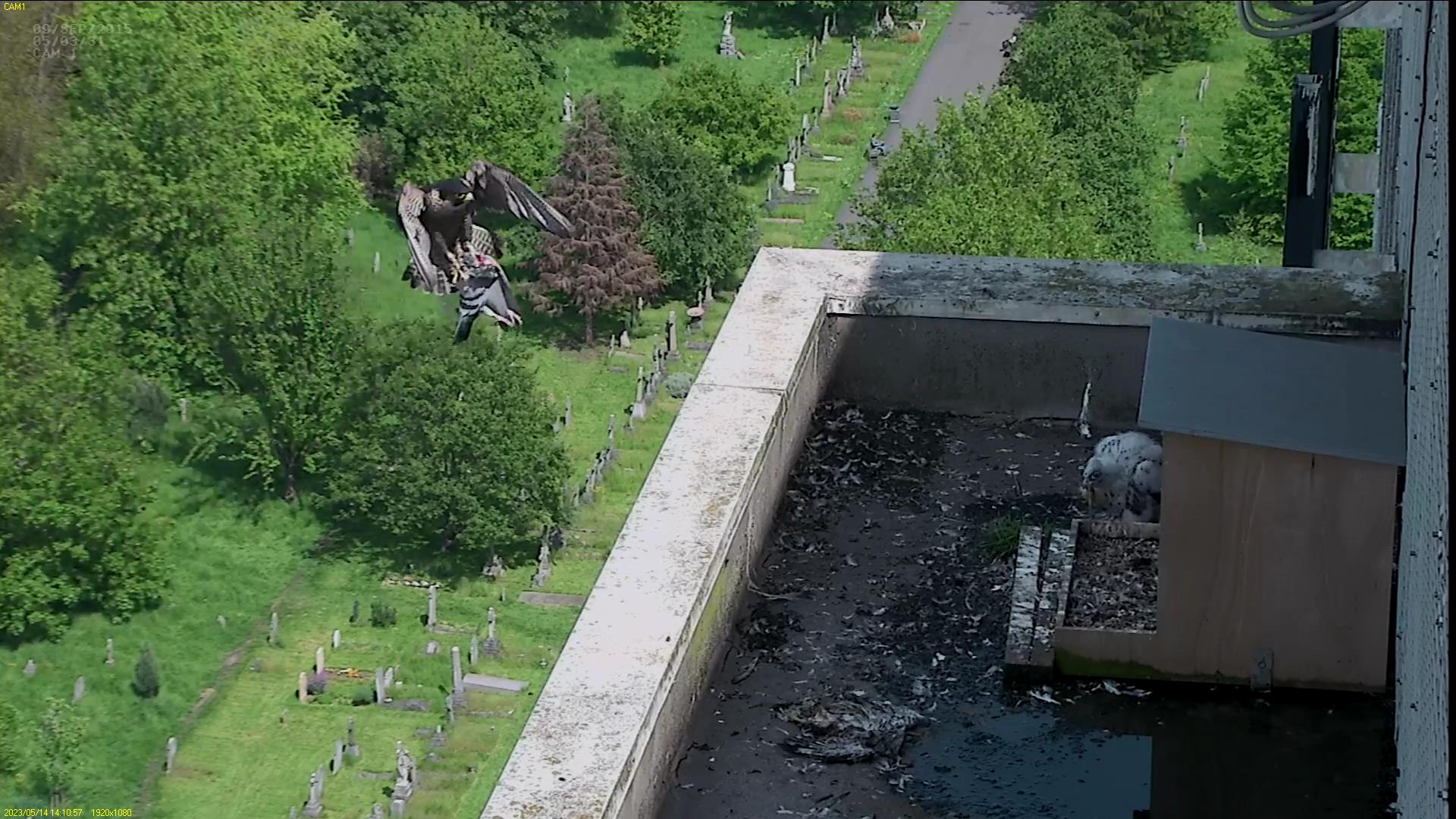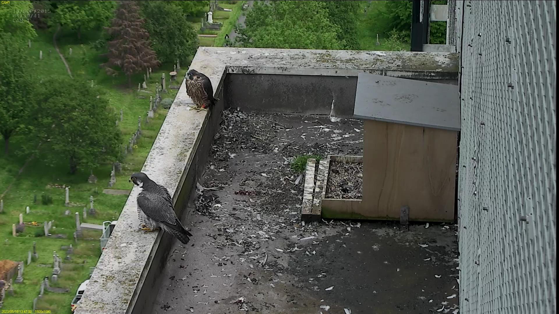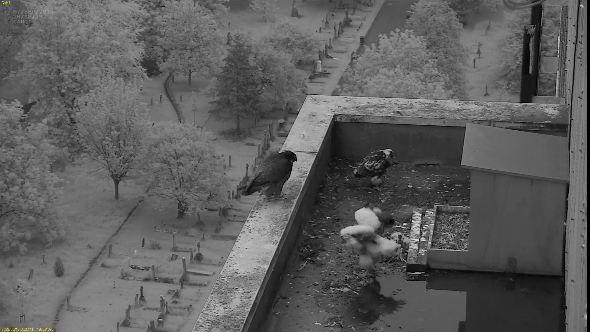 Chick #2 is still full of energy and has been exploring the ledge multiple times today. It is turning into a beautiful dark Peregrine as revealed in the last couple of days with a lot of down falling off. Soon it’ll be just those fluffy pantaloons left!
