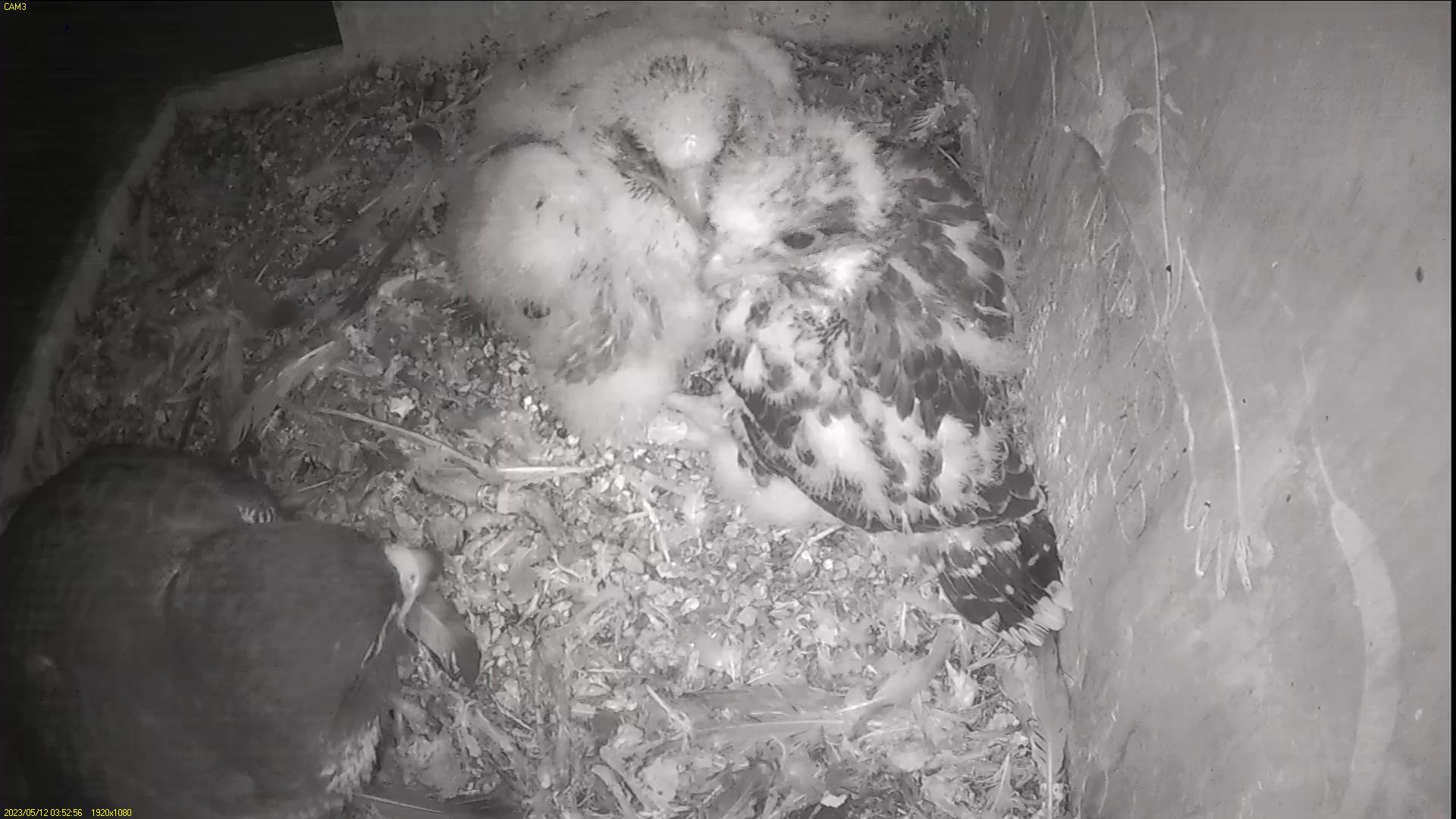 It has been a tough day. It all started last night after I posted the daily update and I checked the cameras. I noticed that Chick #1 had either been crying since the last feed or had trouble breathing. When I checked this morning, it wasn’t any better. We made plans to pick it up tomorrow at ringing if it wasn’t improved and have it checked up at Wildlife Aid. Throughout the morning it seemed to perk up from time to time and ventured outside a couple of times. At one point it lost its balance and fell on the ledge floor but picked itself up again. It pancaked with Chick #3 in the box for a while. Then around 12:30 it got up, went out of the box, to the hidden corner for a while. At 12:55 it came back to the wall in front of the box, collapsed and drew its last breath.
