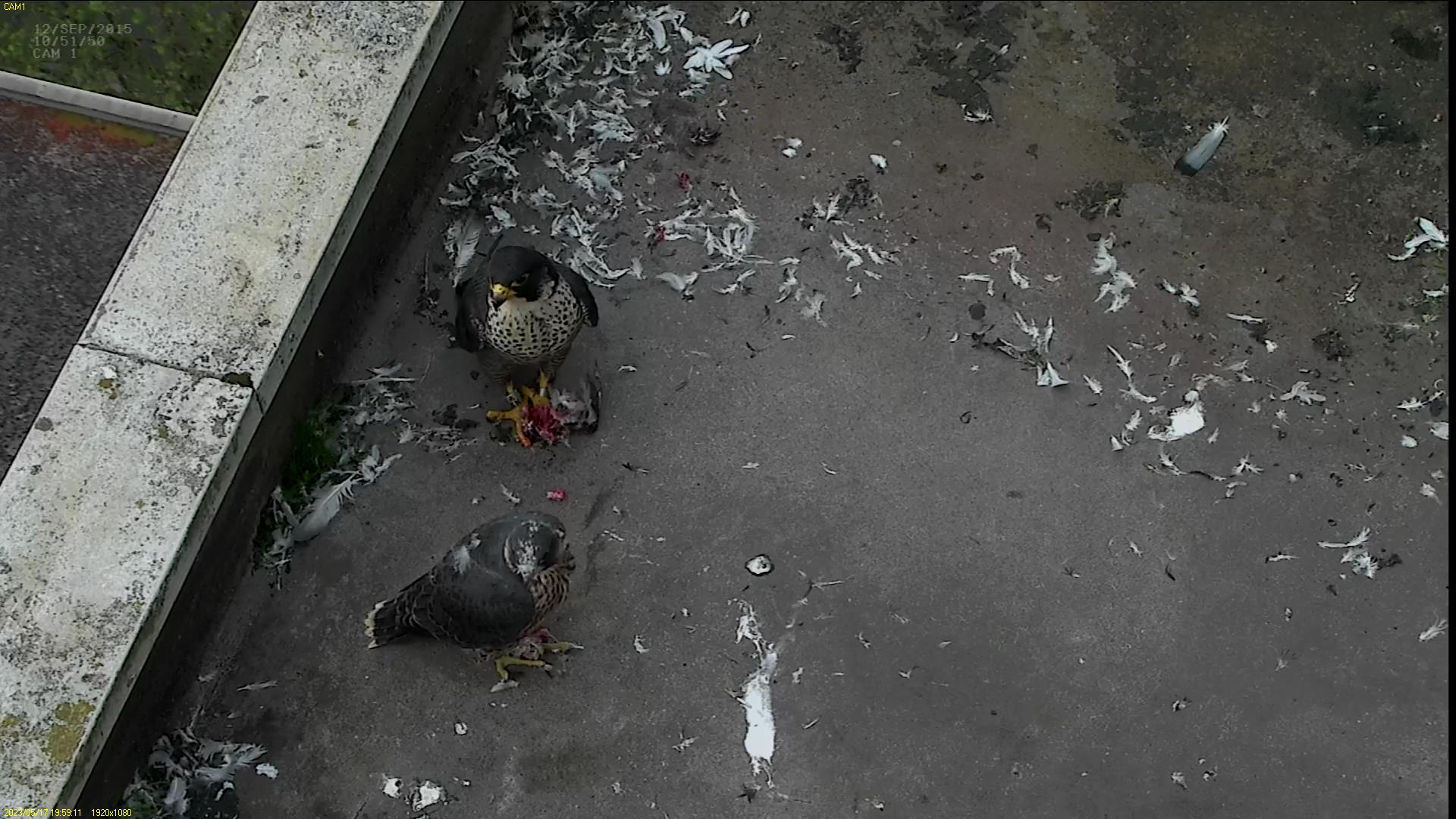 Azina finally brought some Parakeet at the end of today. A break from that endless Pigeon diet. She fed it to them in two feeds. The two previous feeds were more Pigeon.