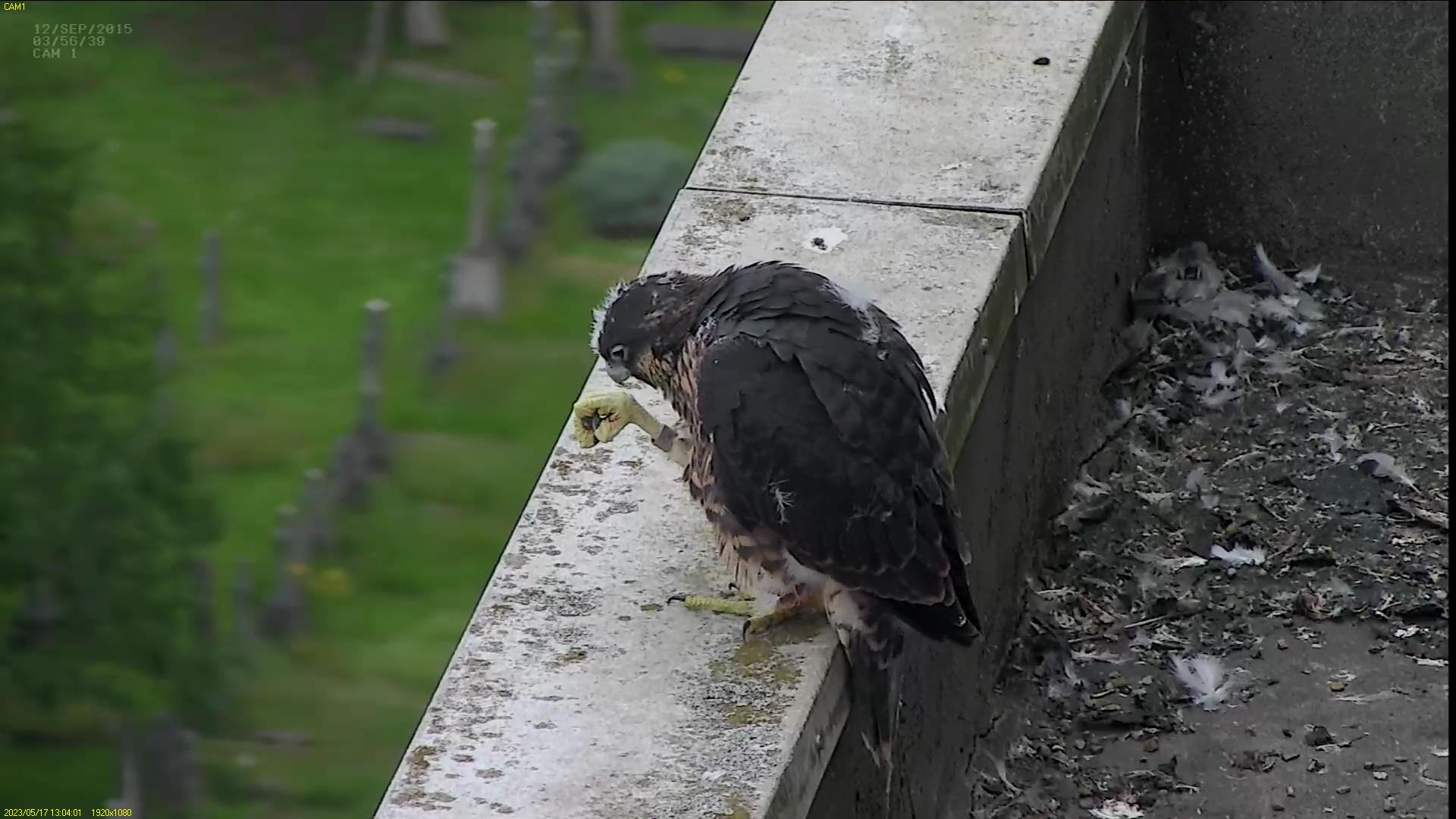 Back a the hospital P6T was in shock for a while but finally settled down around 12:30 and pancaked for a few hours. He woke up around 4:15pm, went out and found some food Azina had cached earlier to feed himself. He jumped on the wall at 4:48pm and has been there the whole time since apart from about a minute. It’s past 9pm as I’m typing this and he’s still there. He’s sat, flapped, preened on there. He’s walked it from one end to the other a couple of times. He even had dinner on it when at long last Azina brought him food and he had his first and only feed of the day. He seems very comfortable on it and has even sat on the outside edge.