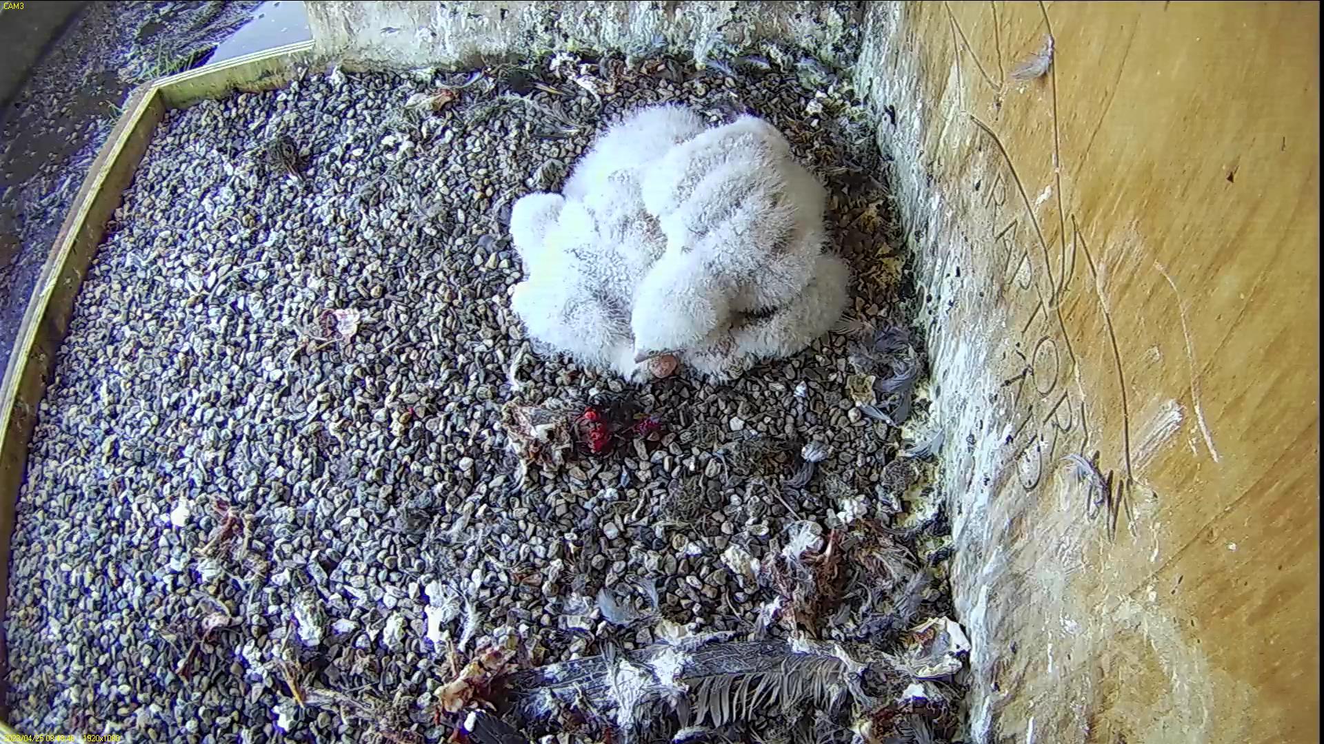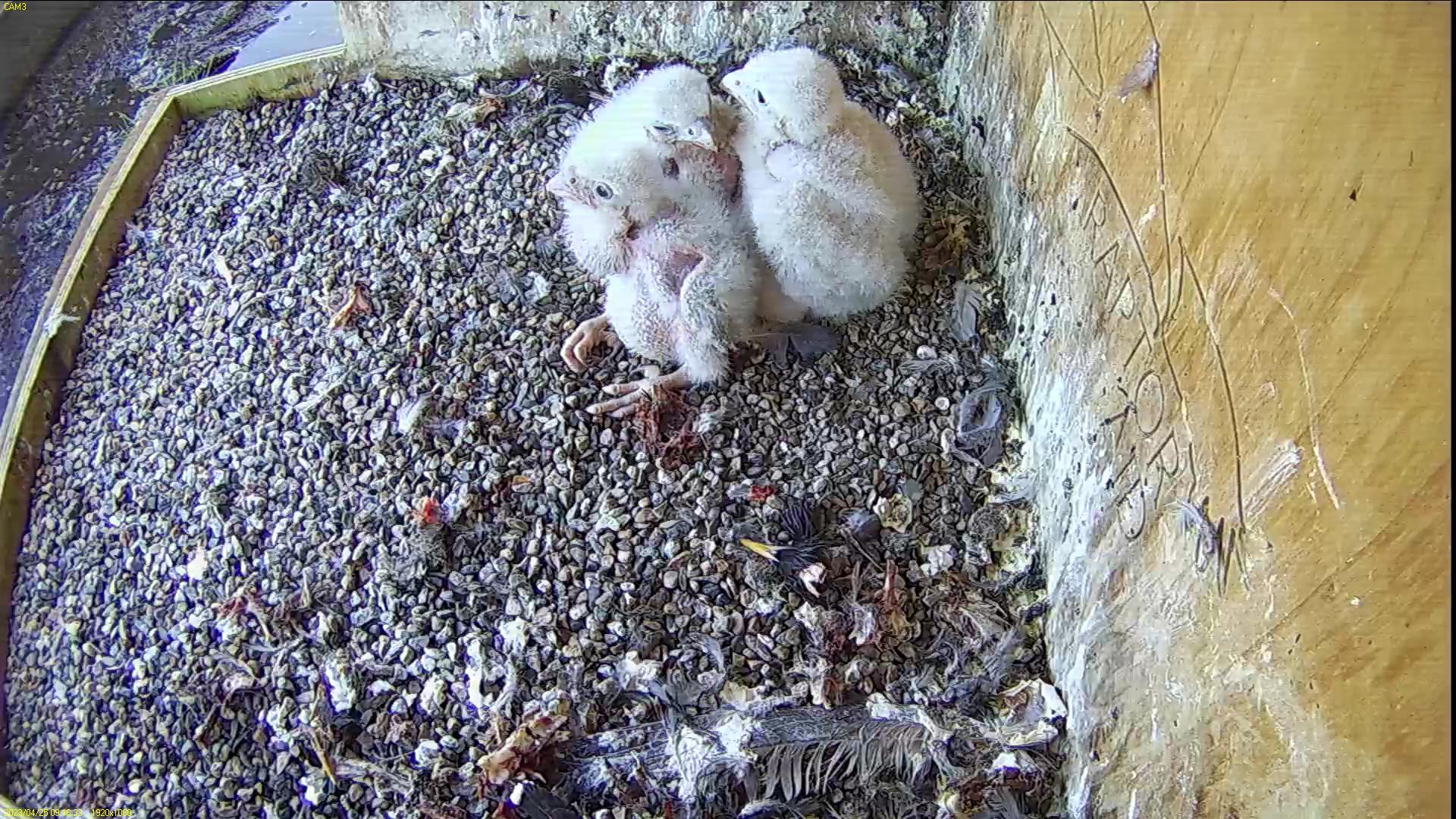 The first chick is two weeks old! How time flies! It, and its siblings, has had a great day of sleep and food 😉 With a little bit of preening and flapping, and some shuffling around.