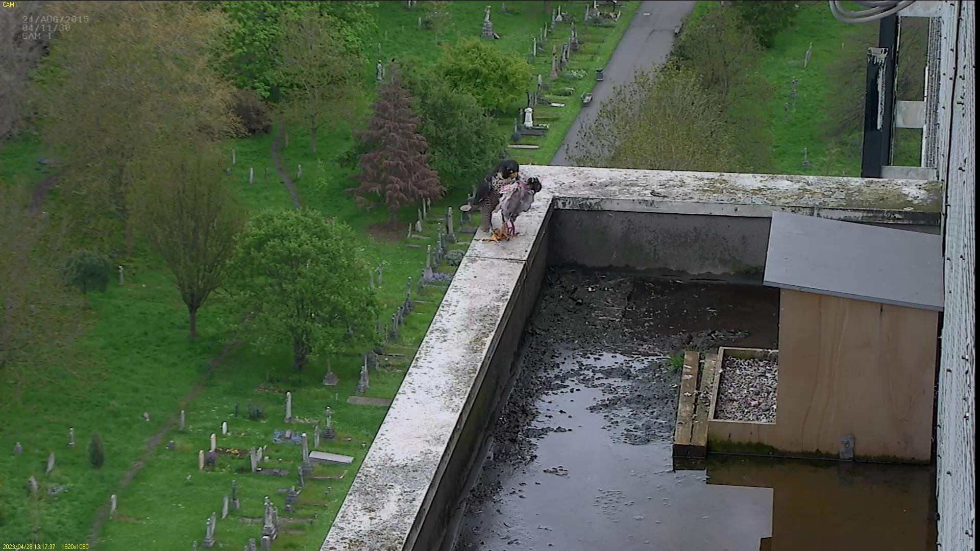 Tom and Azina spent a lot of time perched by the side of the ledge today, either separately or together. In the morning Azina spent a lot of time disturbing the chicks’ sleep by pottering in the nest box for nothing in particular.