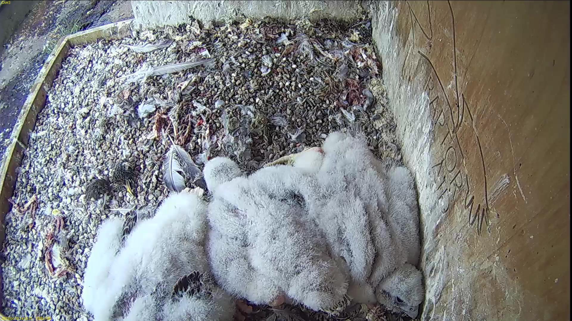 There were seven feeds, usually not very long except for one that lasted 40 minutes. Only pigeon on the menu. Maybe tomorrow chick #2 will also stand up? Maybe chick #1 will decide to explore a bit more?